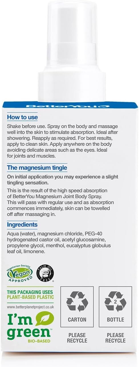 Magnesium Muscle Body Spray is an effective magnesium supplement formulated to soothe hard-working muscles. It contains a natural blend of magnesium chloride and energising lemon oil, arnica and capsicum to add a gentle heat to speed up recovery time. Magnesium is vital for optimal muscle contraction, skeletal strength, energy production and assists in sustaining the high oxygen consumption necessary for athletic performance. BetterYou Magnesium Muscle Body Spray helps replenish magnesium, supports optimal performance during training and aids muscle recovery post-training. An essential mineral in exercise recovery, Magnesium contributes to the reduction of tiredness and fatigue, the normal functioning of muscles and maintenance of healthy bones and teeth. Magnesium also aids electrolyte balance and supports normal energy-yielding metabolism. It also plays a part in normal psychological function and healthy functioning of the nervous system.