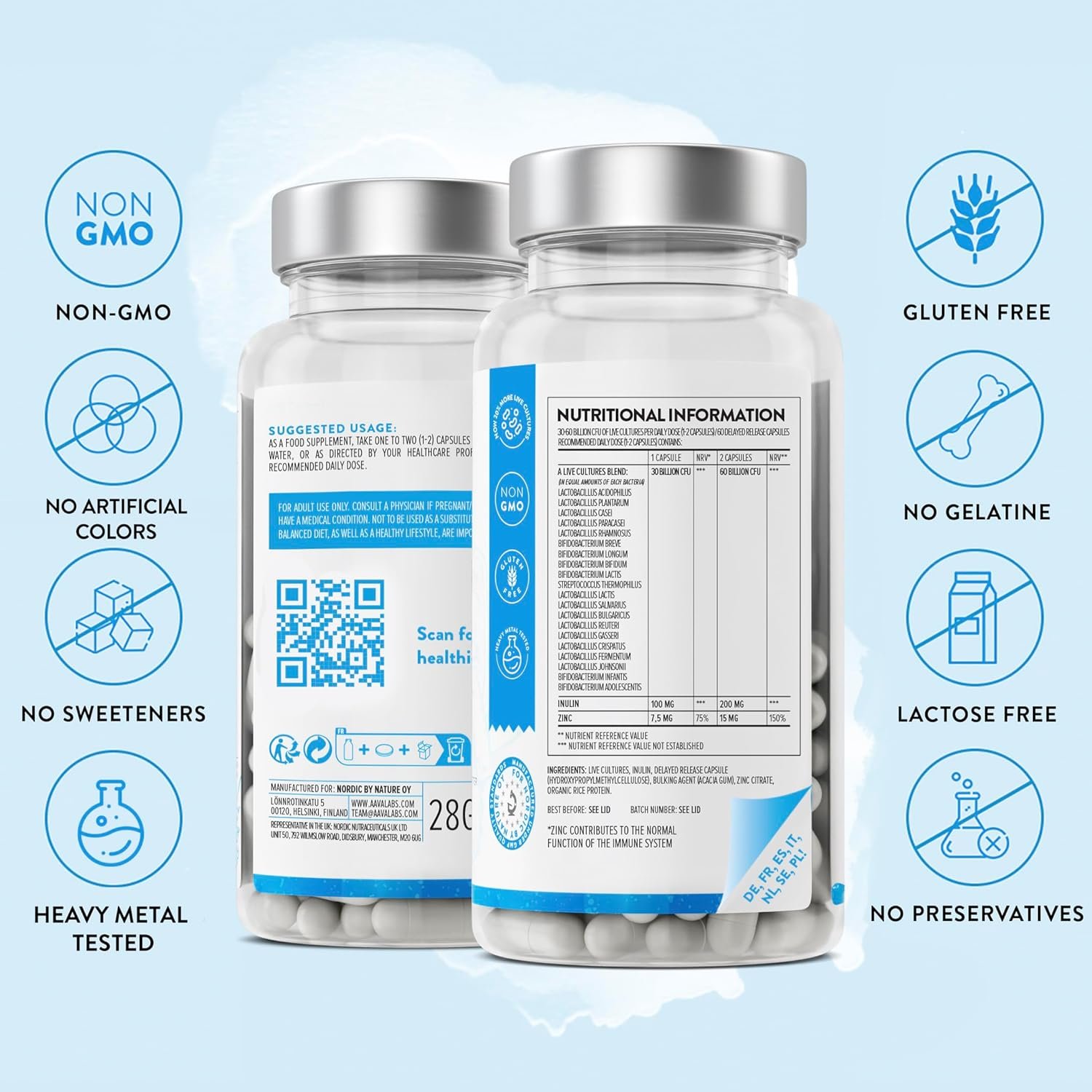 ➤ MAX POTENCY 60 BILLION CFUs – We have used the most advanced technologies and the latest manufacturing techniques to ensure that each of our capsules contain a minimum of 25 Billion CFUs + added Zinc which contributes to normal function of the immune system. 20 different bacterial strains, including lactobacillus gasseri, lactobacillus acidophilus, lactobacillus rhamnosus as well as inulin support a healthy intestinal flora.