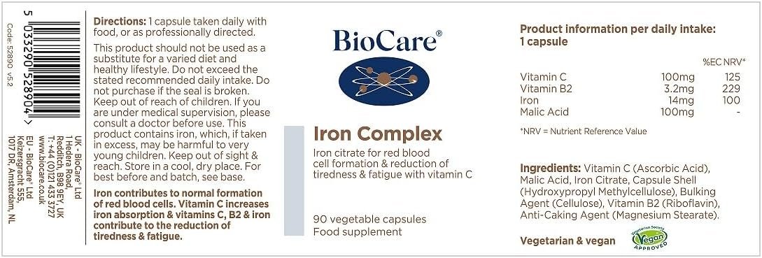 BioCare Iron Complex: Contains iron with malic acid, vitamin C & vitamin B2 for optimum iron absorption. It is particularly suitable for individuals who are sensitive to standard iron supplements