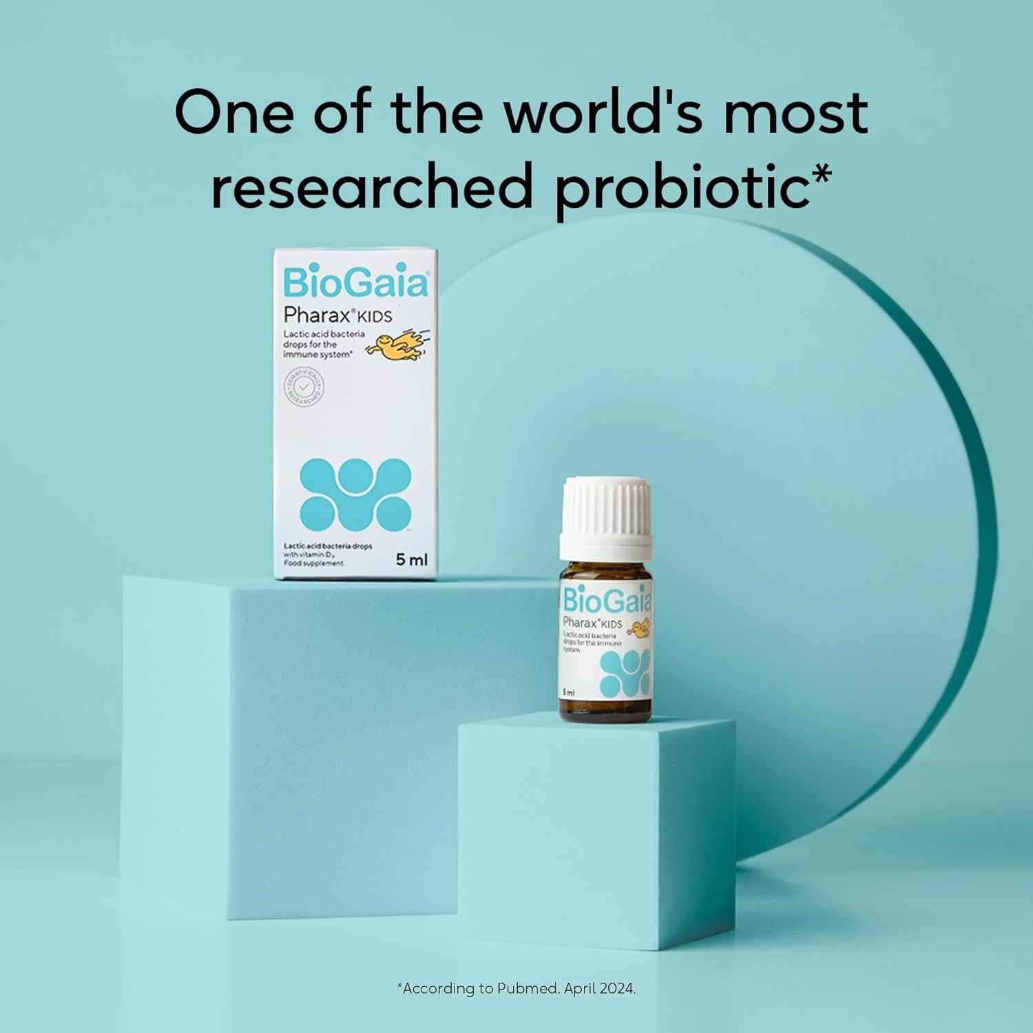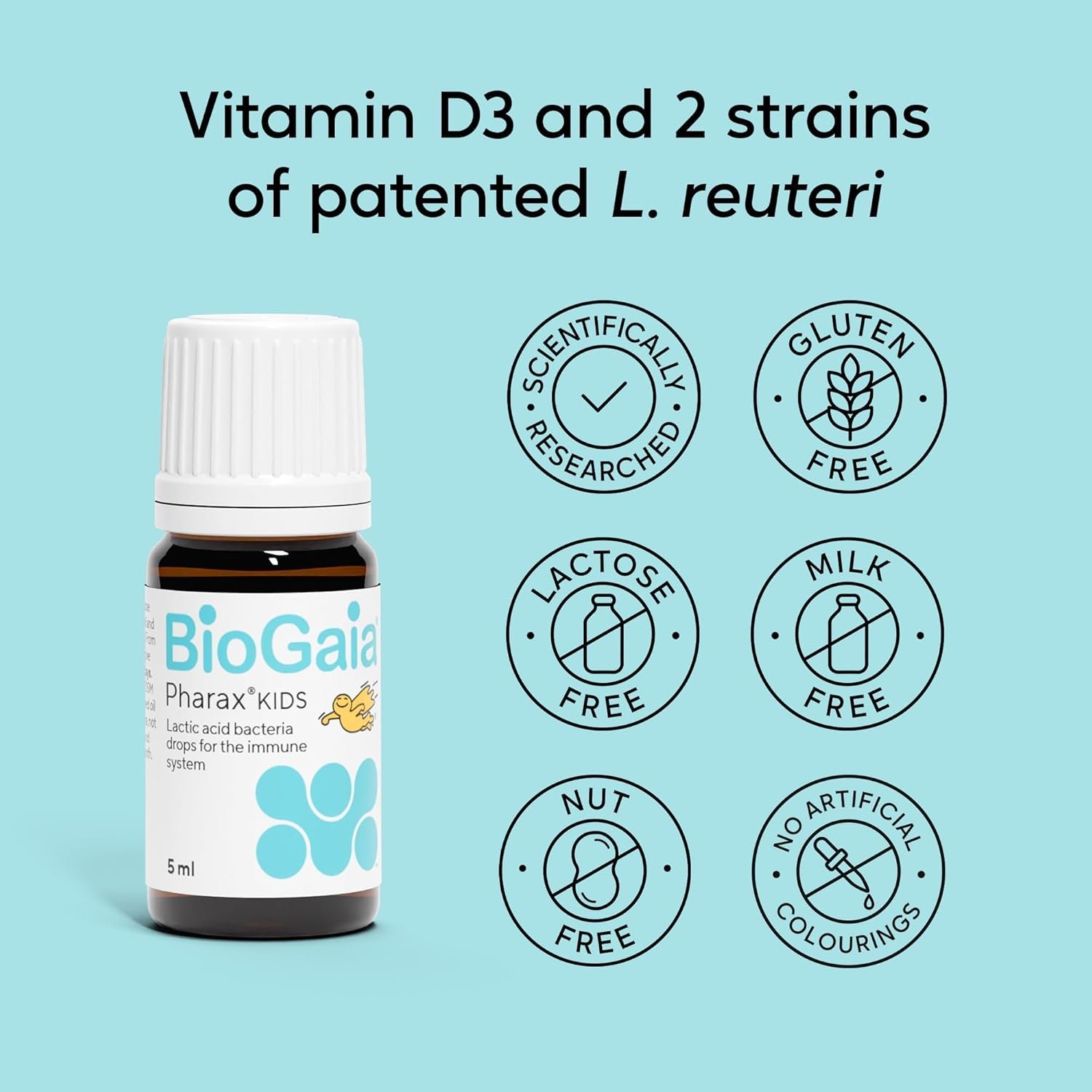 BioGaia Pharax Kids Drops with Vitamin D | Probiotic Supplement for Children & Toddlers | Immune Support with 100 Million Live L. Reuteri Probiotics | Features LongevityGuard | 5 ml