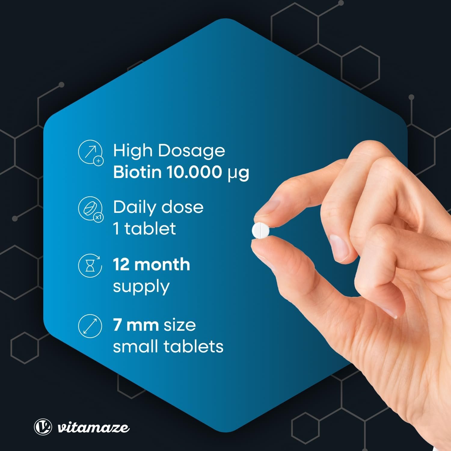 Biotin 10.000 mcg (1year Supply) with Selenium + Zinc, Hair Growth, Skin and Nails Nourishment, 365 Vegan Easy to Swallow Tablets, German Quality, Vitamaze®