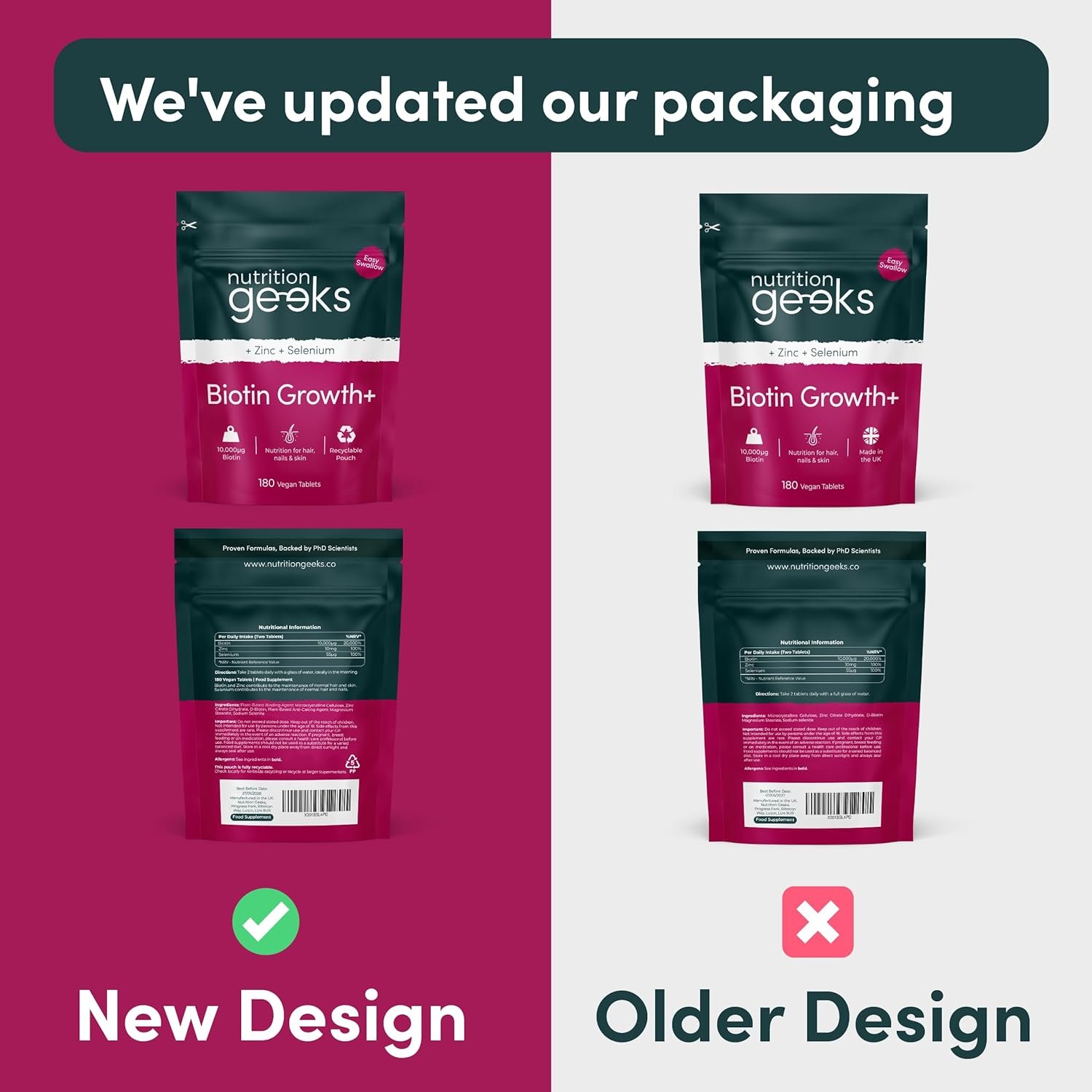 Less Plastic, Less Waste – We care about the environment and have reinvested vast resources into sourcing high quality, ethical UK suppliers of supplement packaging for our Biotin Growth+ hair vitamins for women and men. Becoming ‘Net Zero’ doesn’t happen overnight and we plan to continually reinvest sustainably strictly into UK resources to support our local economy.