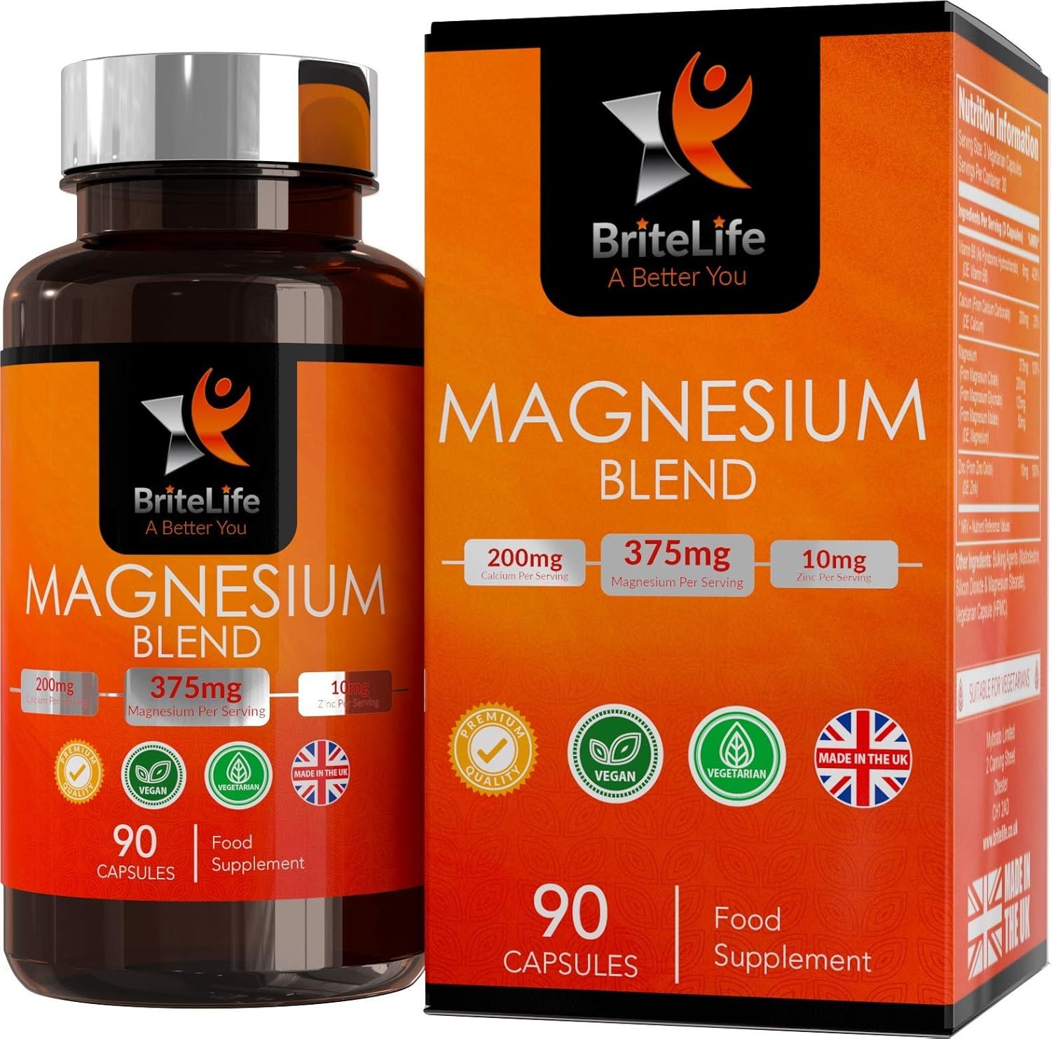 THE INGREDIENTS – Magnesium (From Magnesium Citrate) 200mg Magnesium (From Magnesium Glycinate) 125mg, Magnesium (From Magnesium Malate) 50mg, Calcium (From Calcium Carbonate) 200mg, Zinc (From Zinc Oxide) 10mg, Vitamin B6 (As Pyridoxine Hydrochloride) 6mg
