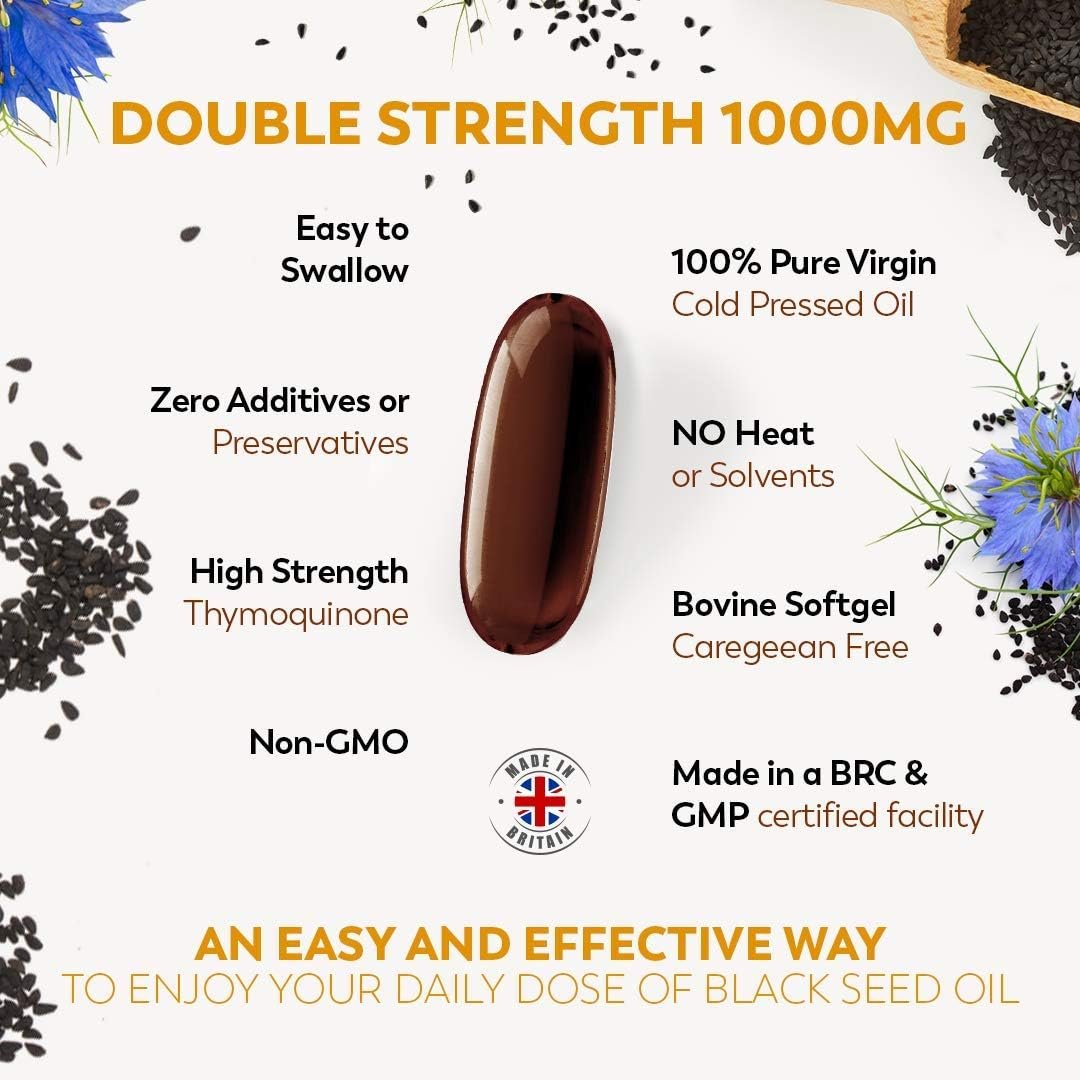 HIGH STRENGTH BLACK SEED OIL in an easy to swallow double strength softgel capsule. Made from premium Nigella Sativa seeds (also known as Black cumin or Kalonji oil) that contain 3 to 4 times more Thymoquinone than most black seed oils due to the traditional farming in nutrient rich soil.