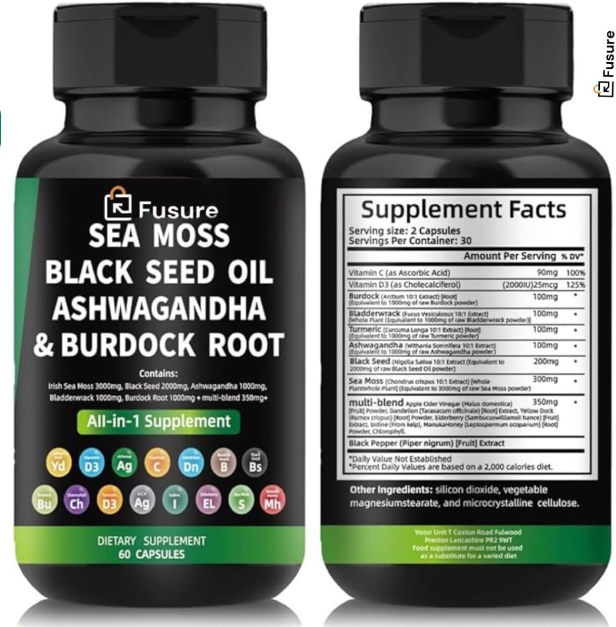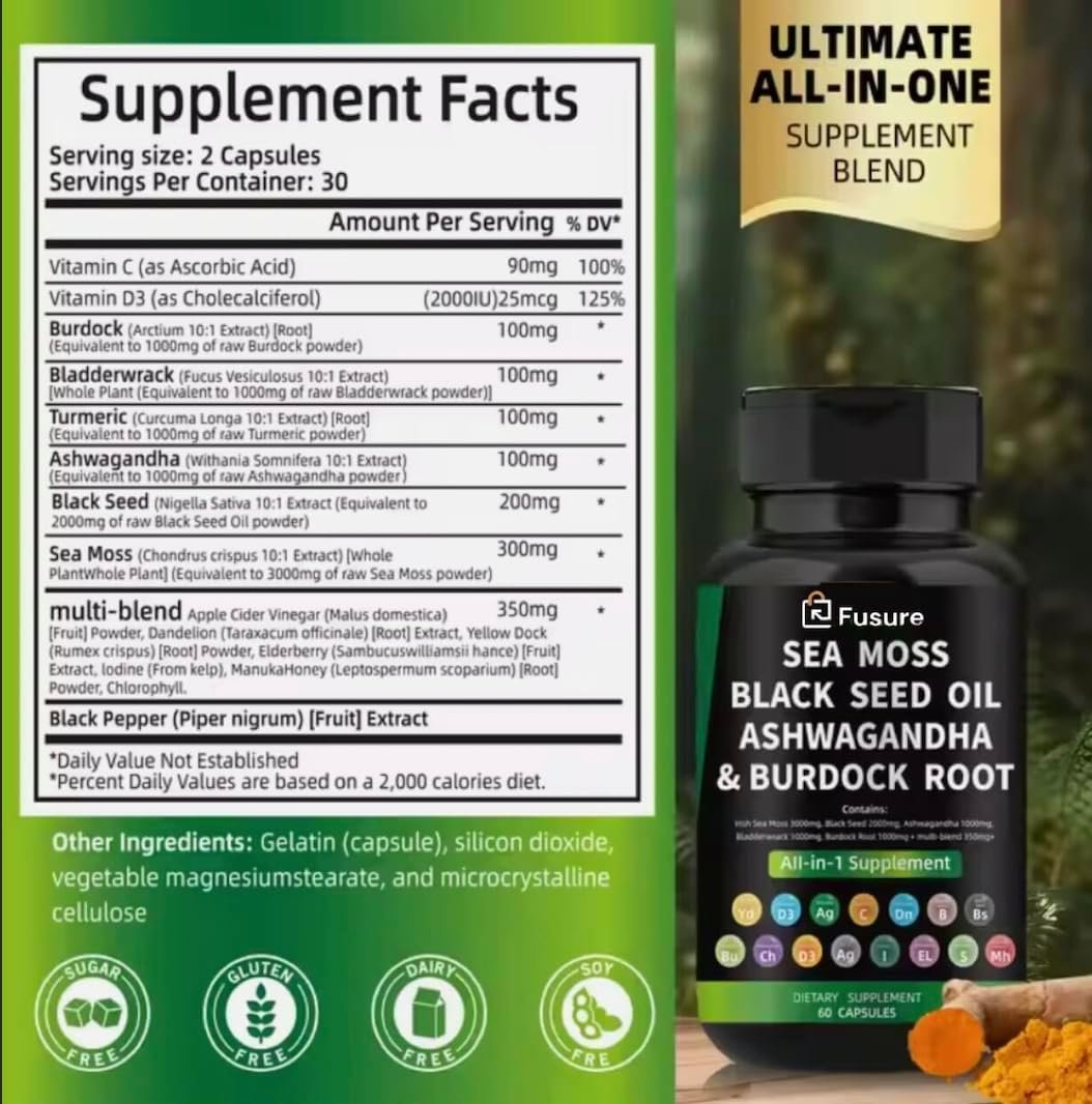 All-in-One Wellness Solution: Fusure Irish Sea Moss Capsules, suitable for both men and women, deliver a comprehensive health boost with 15 thoughtfully selected ingredients. This includes Irish Sea Moss, Black Seed Oil, Ashwagandha Extract, Bladderwrack, Turmeric Curcumin, Burdock Root, Chlorophyll, and more! The synergy of Sea Moss and Black Seed produces outstanding benefits.