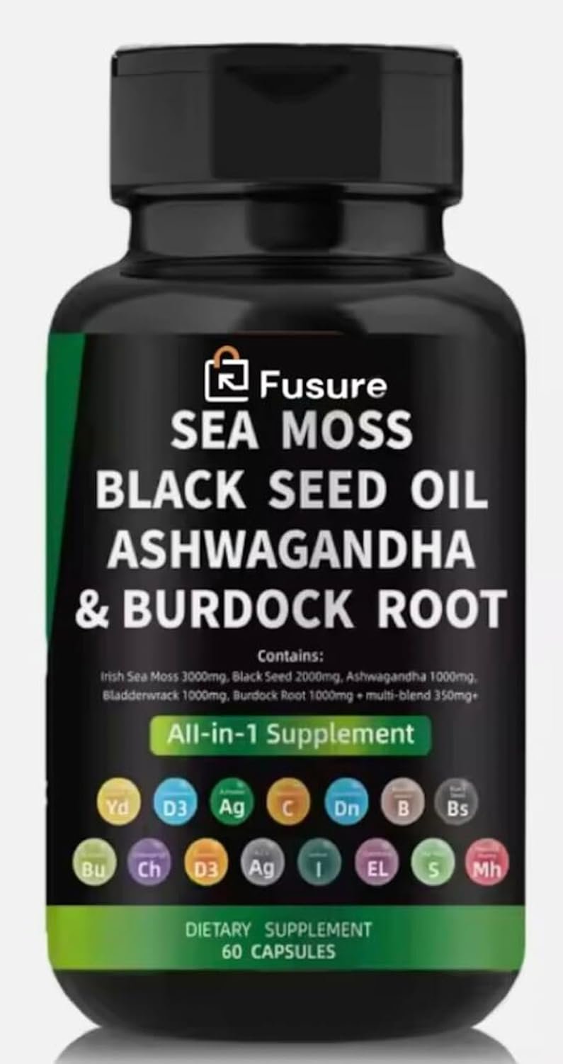 All-in-One Wellness Solution: Fusure Irish Sea Moss Capsules, suitable for both men and women, deliver a comprehensive health boost with 15 thoughtfully selected ingredients. This includes Irish Sea Moss, Black Seed Oil, Ashwagandha Extract, Bladderwrack, Turmeric Curcumin, Burdock Root, Chlorophyll, and more! The synergy of Sea Moss and Black Seed produces outstanding benefits. Robust MultiMineral Blend: Experience the advantages of six powerful ingredients combined in a single capsule. Each serving is packed with generous amounts of Irish Sea Moss Powder, Black Seed Powder, Ashwagandha Extract, Bladderwrack Powder, and Burdock Root Powder, ensuring you receive optimal nutritional support without the complexity of multiple supplements. Advanced Formulation: Fusure has expertly blended Irish Sea Moss, Black Seed Oil, Ashwagandha, Bladderwrack, and Burdock Root to create an effective formula that supports overall health. This dynamic mix is designed to enhance hair vitality, boost immune response, and promote overall energy—making it an essential addition to your daily regimen. High-Quality, Reliable Ingredients: Our Irish Sea Moss Capsules are produced with great attention to detail, using only the finest Irish Sea Moss, Black Seed Oil, Ashwagandha, Bladderwrack, and Burdock Root. We prioritize quality to ensure you receive premium ingredients for your health journey. Sustainable and Natural: We believe in leveraging nature’s power to aid your health goals. Our Irish Sea Moss is ethically sourced and meticulously harvested to maintain its natural potency, providing you with a clean, environmentally friendly supplement you can trust.