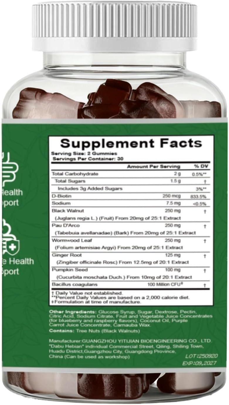 Targeted Herbal Synergy for Digestive Support – Experience the harmonious blend of Black Walnut, Wormwood Leaf, and Pau D’Arco, carefully formulated to help support digestive function and comfort. With added Ginger Root and Pumpkin Seed extracts, these gummies help promote daily digestive wellness. Perfect for those seeking a tasty yet effective alternative to traditional liquid herbal supplements