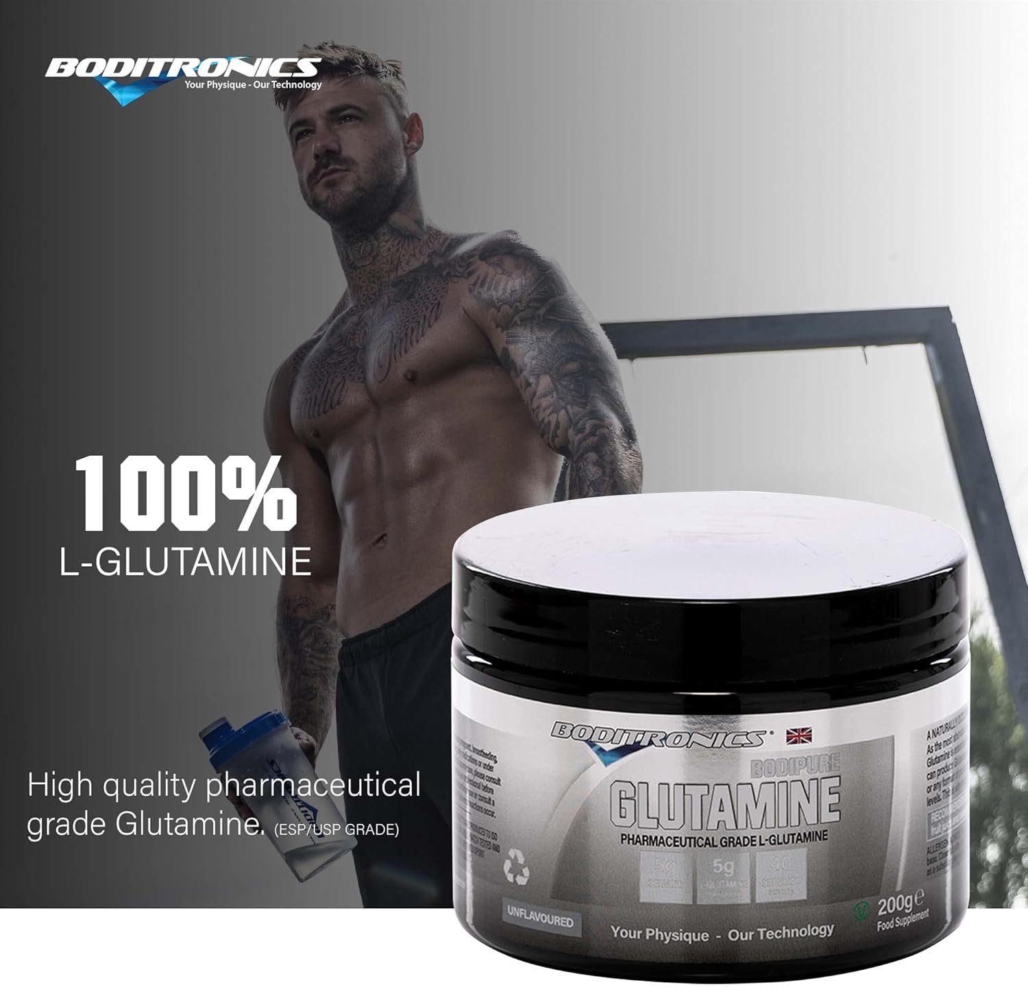 Boditronics Bodipure 200g L-Glutamine Powder Unflavoured with Amino Acid, Glutamine, Boost Immune System for Muscle Growth & Recovery increase power, energy, and strength