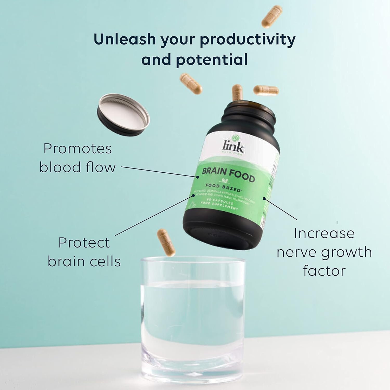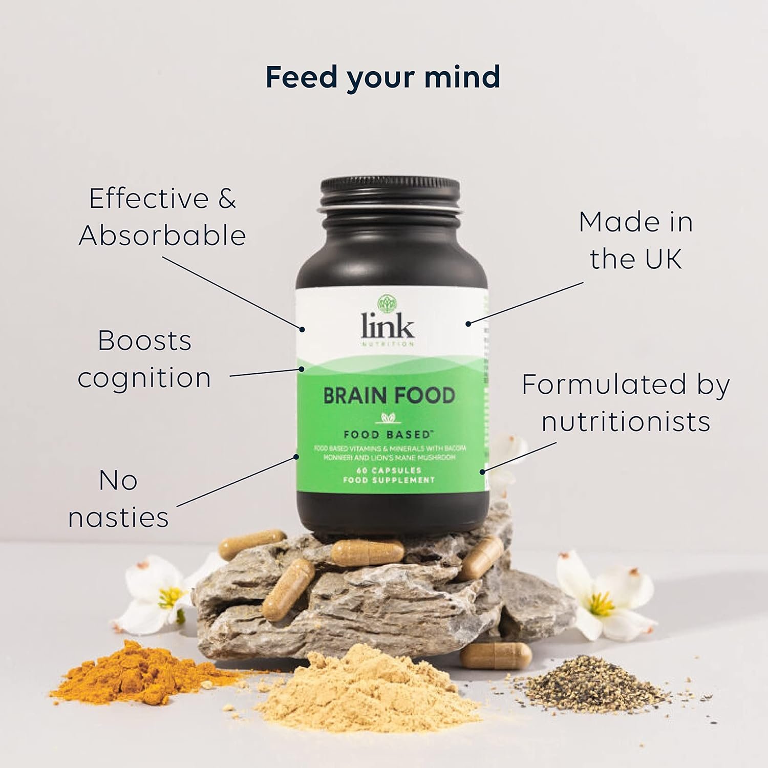[Brain Food] Food Based Supplement | Contains Bacopa Monnieri, Lions Mane Mushroom & Turmeric | Safe – Effective – Absorbable | Vegetarian | Made in The UK by Link Nutrition | 60 Vegecaps