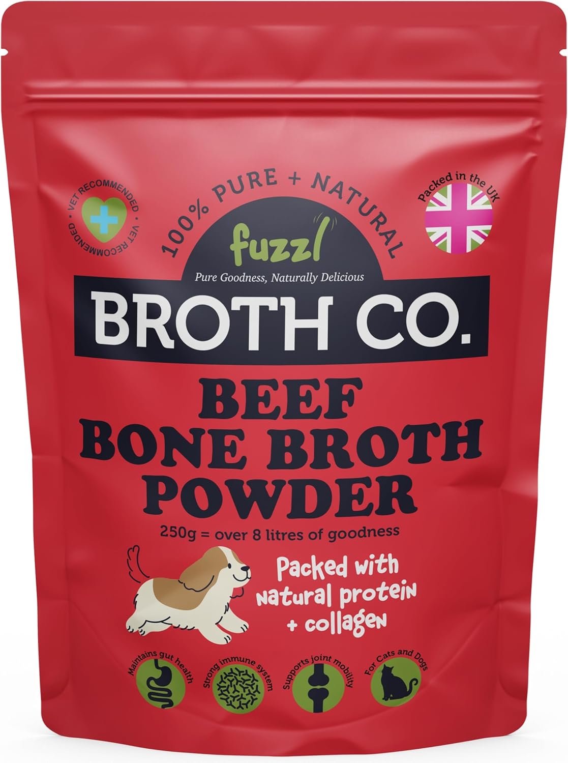 Text reads 'Human Grade', '100% PURE + NATURAL', 'fuzzl BROTH CO.' with UK flag icon. Brand logo on red background showing natural broth company branding.Text reads 'Human Grade', '100% PURE + NATURAL', 'fuzzl BROTH CO.' with UK flag icon. Brand logo on red background showing natural broth company branding.