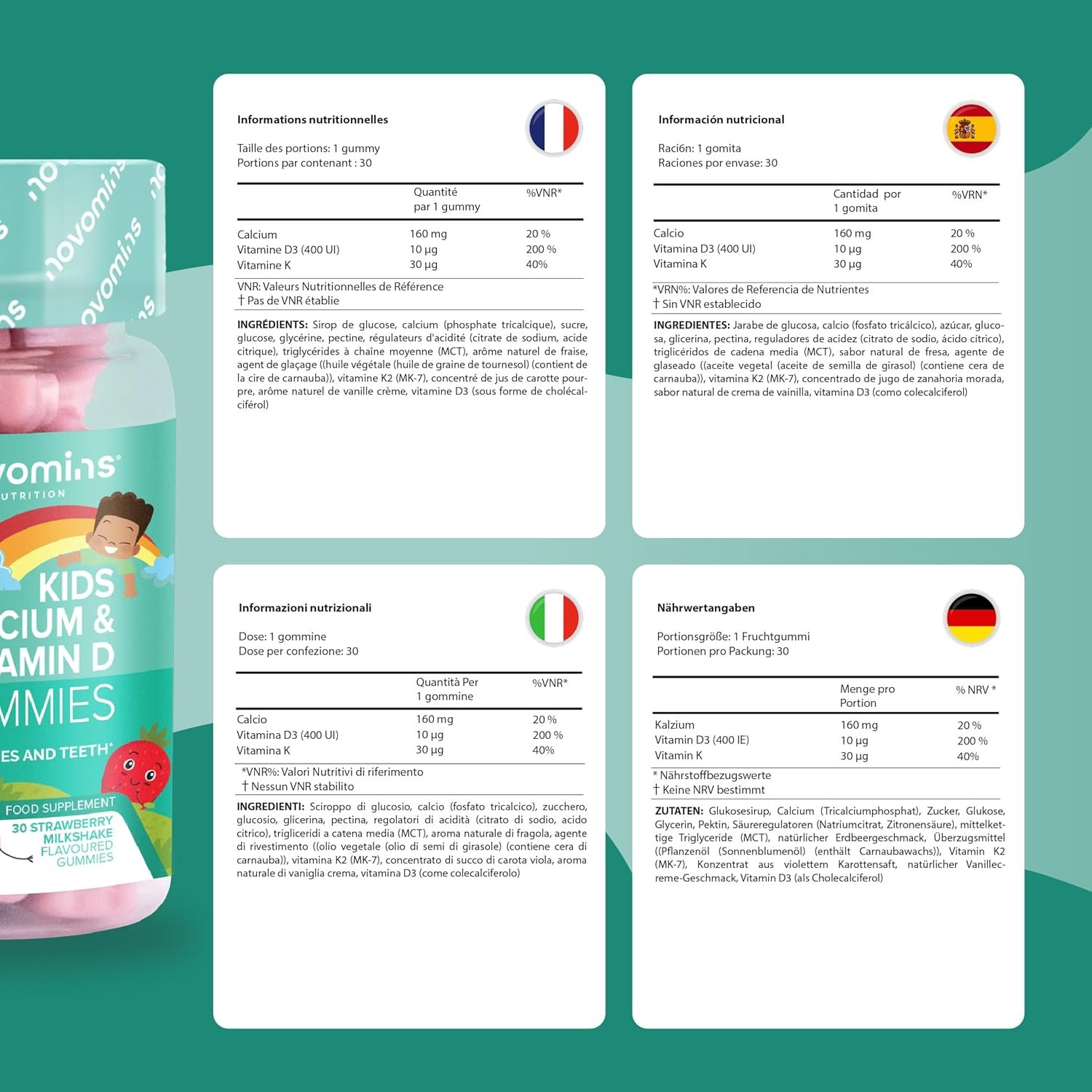 WHY NOVOMINS KIDS CALCIUM GUMMIES: Novomins prides itself in bringing you the highest quality supplements whilst being safe and ethically sourced. Our kids calcium gummies are produced under the strictest manufacturing standards (GMP) with the purest quality ingredient, ethically sourced and easily digestible. We also offer a full money back guarantee if you’re at all dissatisfied with our calcium for children.