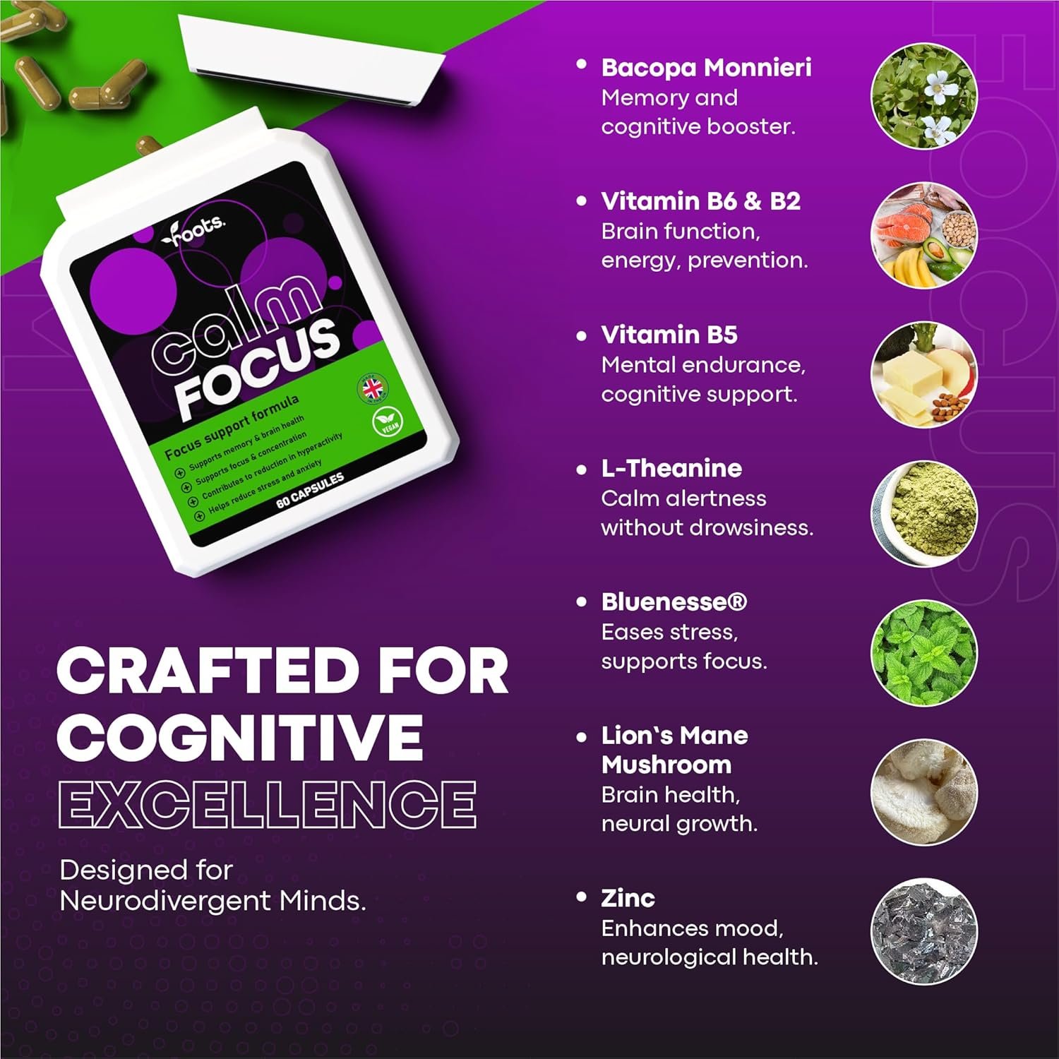 Calm Focus Supplement for Adults – Brain Supplements for Enhanced Focus & Cognitive Support | Brain Booster & Mood Supplement | 60 Caffeine-Free Capsules