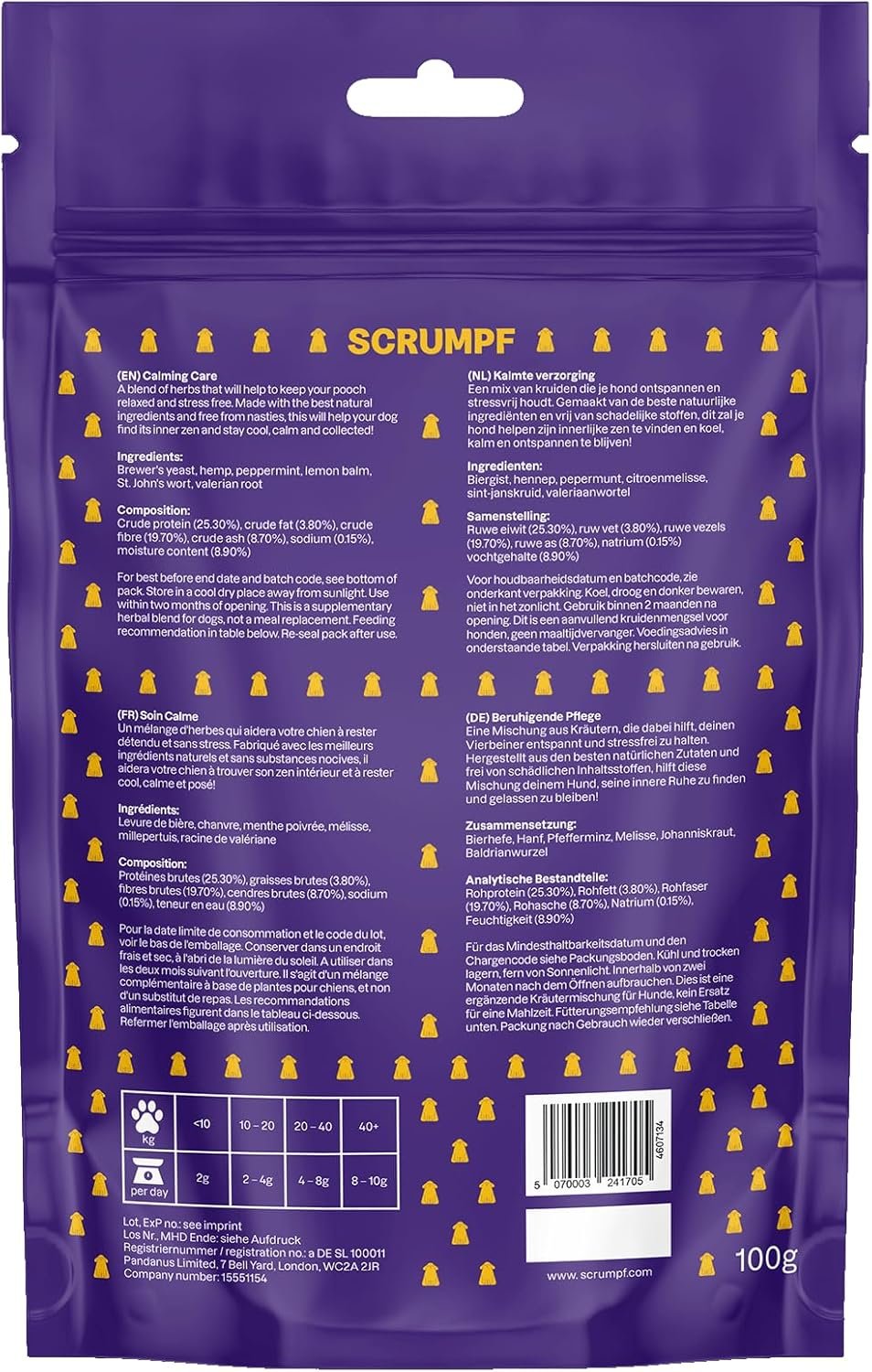 A blend of calming herbs that will help to keep your pooch relaxed and stress free, whether they’re navigating a busy day at home or facing the hustle and bustle of new environments. Made with the best natural ingredients and free from nasties, this will help your dog find its inner zen and stay cool, calm and collected! Ideal for everyday use or during particularly challenging times. With Scrumpf’s calming blend, you can give your furry friend the gift of peace and serenity, allowing them to enjoy their life to the fullest. – Perfect for calming dogs during stress. – Made from natural anxiety relief herbs. – Easy to administer in food or treats. – No artificial ingredients or preservatives.