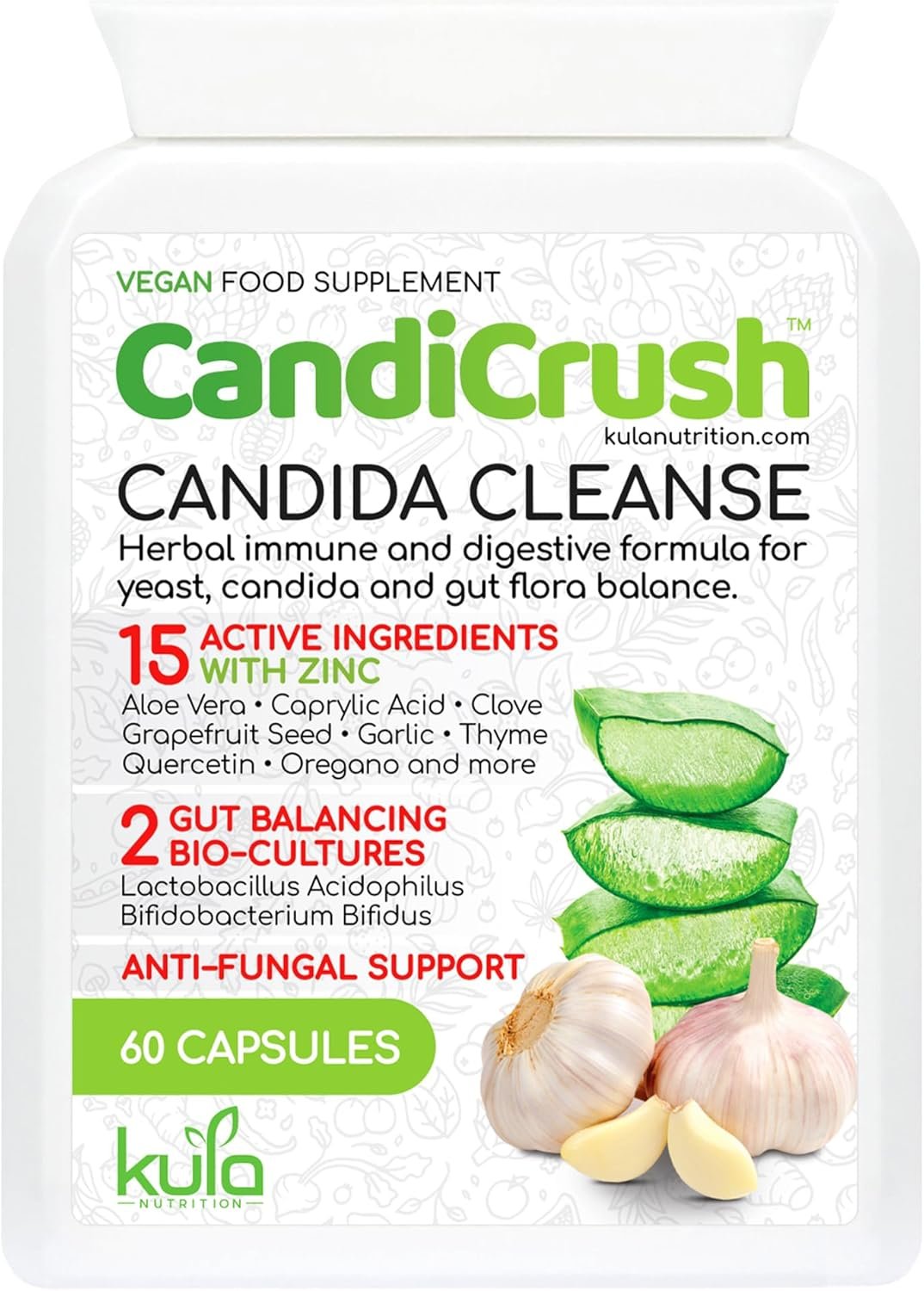 HERBAL CANDIDA CLEANSE – Boost your natural gut and intimate flora (good bacteria) and support your digestive health with our herbal candida cleanse supplement. CandiCrush candida complex is formulated with 15 anti-microbial and anti-fungal herbs with probiotics for candida overgrowth treatment and yeast balance.