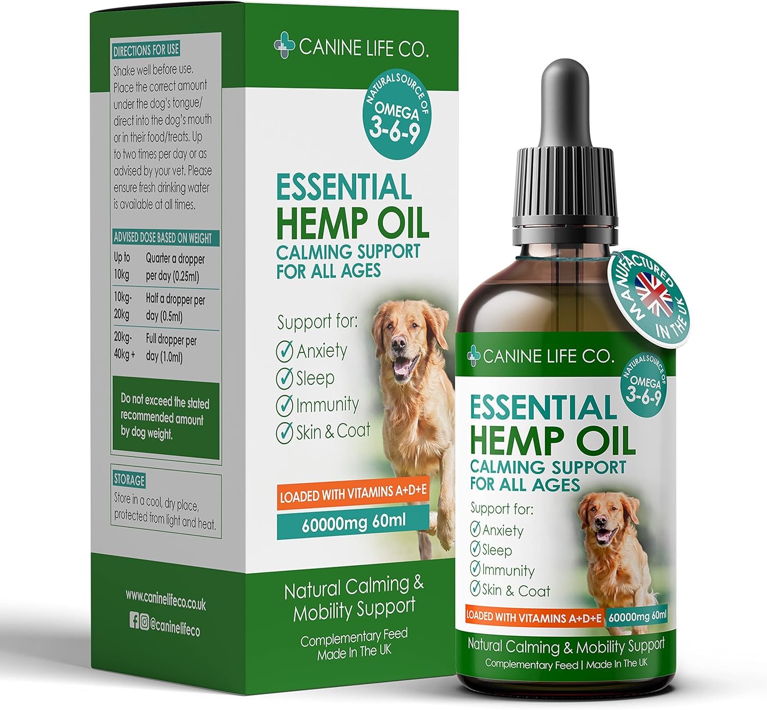 Canine Life Co.® Hemp Oil For Dogs 60ml, 60,000mg – Dog Calming Supplement – Dog Calming Drops – Omega 3,6,9 For Dogs – Supports & Maintains Healthy Joints – Made In The UK (1 Pot 60ml)