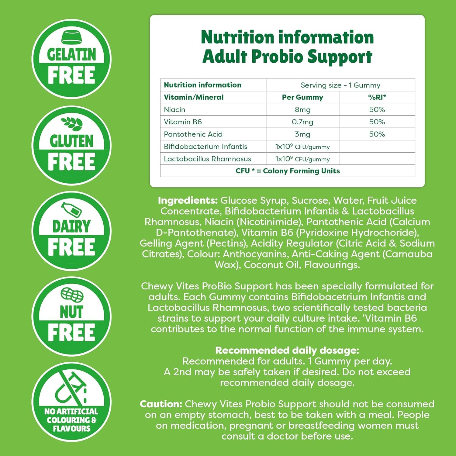 Chewy Vites ProBio Support has been specially formulated for adults. Each Gummy contains Bifidobacetrium Infantis and Lactobacillus Rhamnosus, two scientifically tested bacteria strains to support your daily culture intake. Vitamin B6 contributes to the normal function of the immune system. Fruity chews made with natural fruit pectin and real fruit juice and are suitable for vegeterians. Recommended daily dosage: Recommended for adults. 1 Gummy per day. A 2nd may be safely taken if desired. Do not exceed recommended daily dosage. Caution: Chewy Vites Probio Support should not be consumed on an empty stomach, best to be taken with a meal. People on medication, pregnant or breastfeeding women must consult a doctor before use.