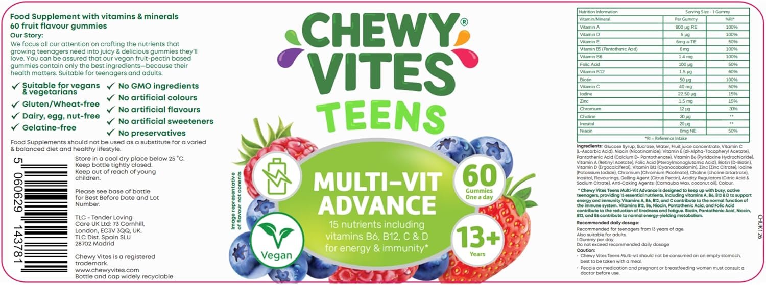 Chewy Vites Teens Multi-VIT Advance, 60 Vitamin Gummies, Teen Vitamins Gummies with 15 Essential Nutrients, 2 Months Supply, Real Fruit Juice, Vegan, Berry Flavour, for Energy and Immunity