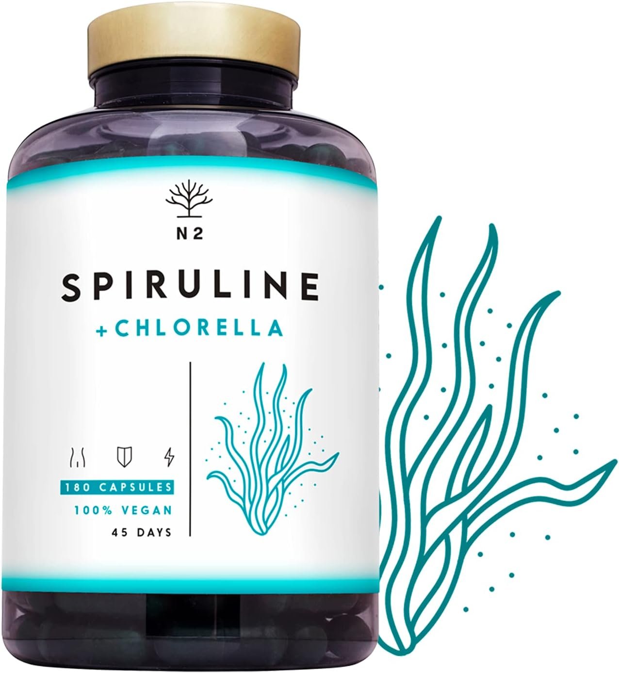 Chlorella Spirulina Tablets 1250mg Powerful Antioxidant,Helps Immune System,Reduces Fatigue.Provides Iron, Eliminates Heavy Metals.180 Vegetable Capsules.1250mg.UK Vegan Certified.N2 Natural Nutrition