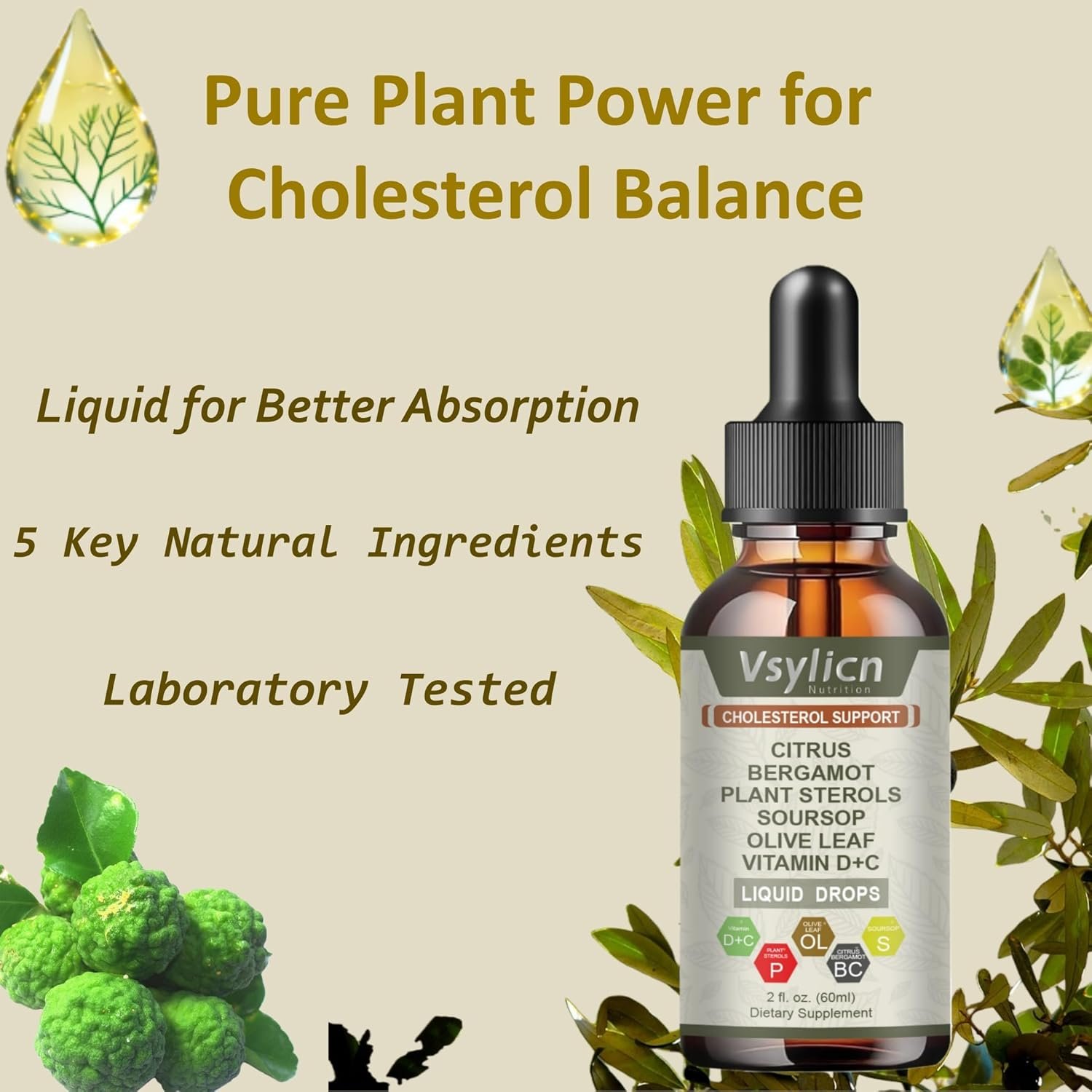 Cholesterol Support Drops with Citrus Bergamot & Plant Sterols – Heart & Lipid Health Supplement with Soursop, Olive Leaf, Vitamins D & C – Natural Vegan Liquid Drops, Alcohol-Free, 2 fl oz (60ml)