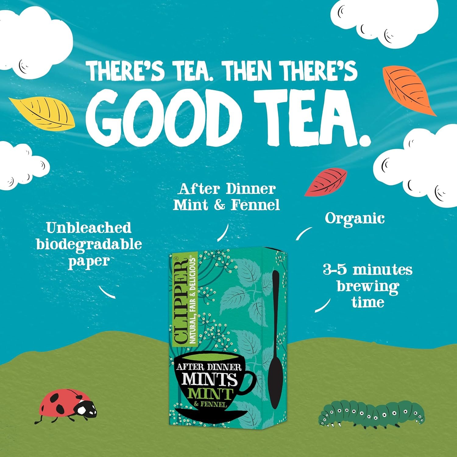 A box of 20 Clipper Organic After Dinner Mints double mint infusion tea bags, featuring spearmint, peppermint, fennel and ginger. The cool, menthol taste of peppermint combines superbly with the natural sweetness of spearmint and the subtle, spicy body of fennel and ginger tea, to provide a truly delicious and refreshing 100% organic infusion. Perfect for after dinner. Our teabags are proudly unbleached, plant-based and biodegradable. Clipper speciality teas are made with pure natural ingredients. We use only the highest-quality sources and add nothing artificial. No wonder they taste so good. These fine, award-winning Clipper tea bags make the perfect teabag gifts, herbal tea gift for a loved one, or to treat yourself to a delicious cuppa every day or when you travel. Ingredients: Organic Peppermint, Fennel seed, Spearmint, Ginger root. At Clipper, we believe that every cup of tea counts. Every cup you drink means weu2019re able to keep doing the good stuff to support people and the planet. Thatu2019s why all our teas are made with eco-conscious, pure ingredients. Discover our Fairtrade teas and traditional blends, and enjoy what goes into every Clipper cup
