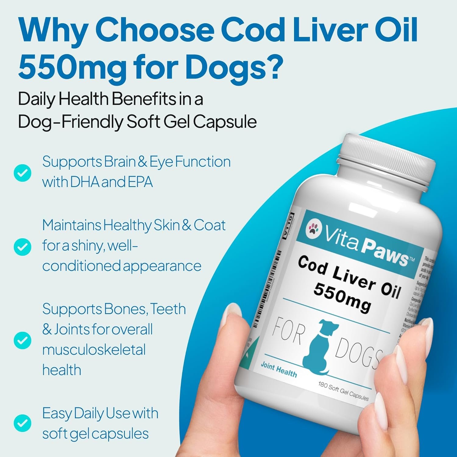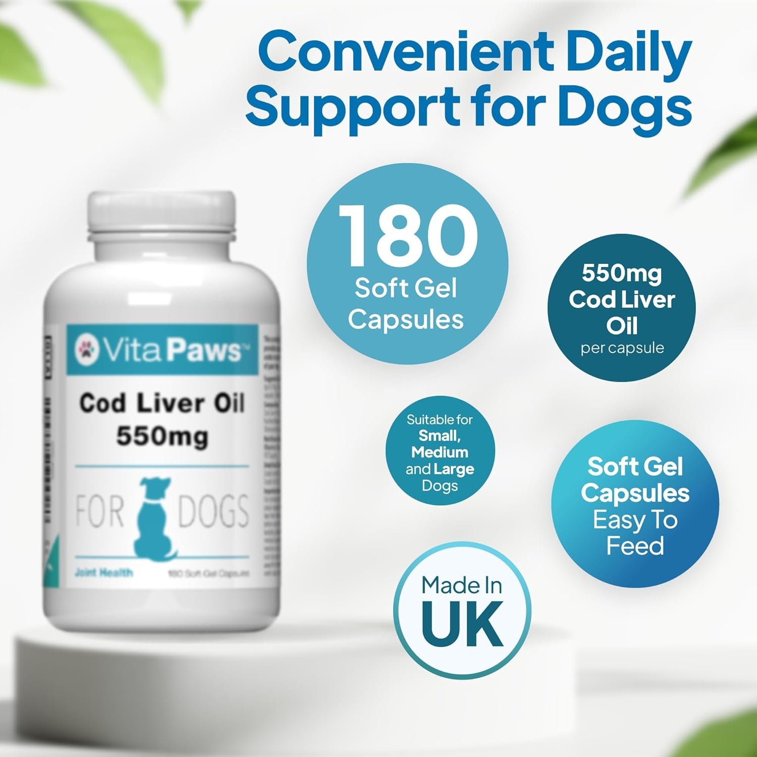 Cod Liver Oil 550mg for Dogs | 180 Soft Gel Capsules | Support the Health of The Skin and Coat | Manufactured in the UK