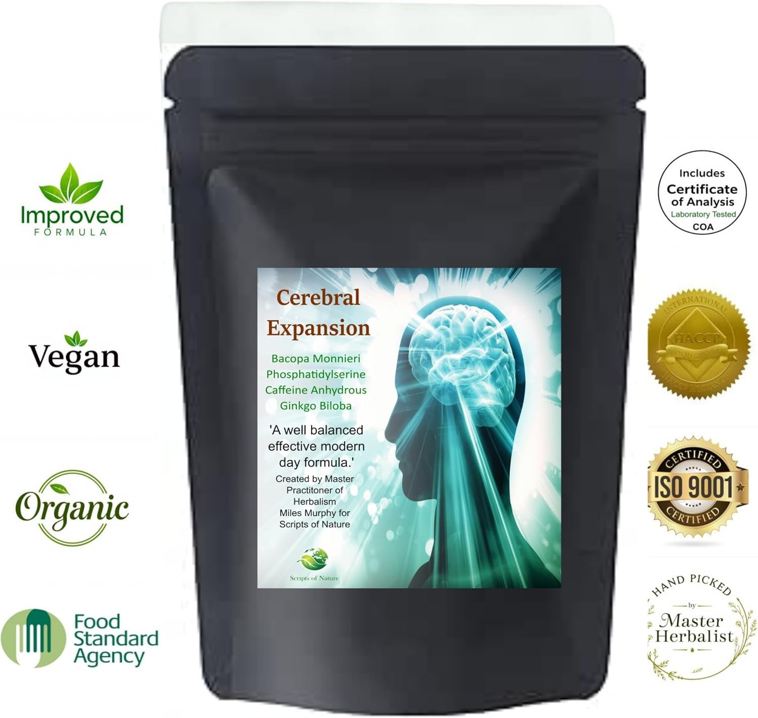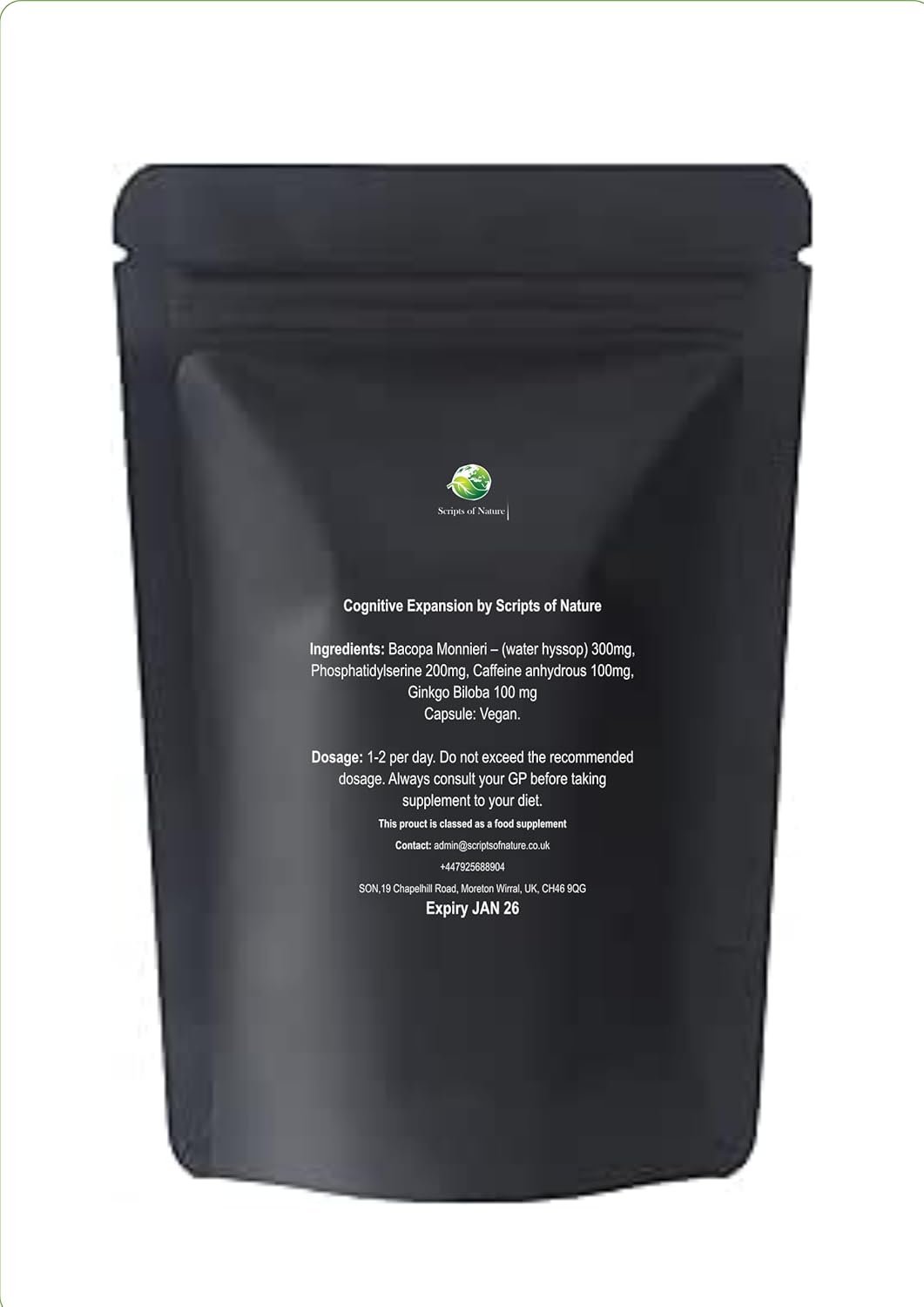 Cognitive Expansion. Created by Master Practitioner of Herbalism Miles Murphy for Scripts of Nature. If you’re looking to unlock your brain’s full potential, then let me introduce you to Cognitive Expansion, a cutting-edge Nootropic Cognitive Enhancer that’s designed to elevate your mental performance. Whether you’re studying for exams, working on a big project, or simply juggling a busy lifestyle, this supplement is your ultimate brain ally. Cognitive Expansion combines nature’s best ingredients with science-backed formulas to boost memory, enhance focus, increase mental clarity, and optimize overall cognitive function. With key ingredients like Bacopa Monnieri, Phosphatidylserine, Caffeine Anhydrous, and Ginkgo Biloba, it’s the perfect synergy for better brain performance. We can’t tell you that there are ‘limitless’ shiny hollywood pills. Fast ups are fast downs. If you want to do it right, you trust in nature.Now the ingredients are going to start building right away and you may feel them after 2-3 weeks but they will keep rising at a pace only nature offers. Let’s break down how these ingredients work together: 1. Bacopa Monnieri – Nature’s Cognitive Enhancer is a slow builder. Perhaps 4-5 weeks. Bacopa has been used for centuries in Ayurvedic medicine for its powerful cognitive benefits, and research supports its effectiveness. Memory & Learning: Bacopa has been shown to improve working memory and long-term retention, even in stressful situations. Neuroprotective Effects: Bacopa promotes neurogenesis—the growth of new brain cells—and helps protect against age-related cognitive decline. Stress Reduction: It also helps lower cortisol levels, reducing stress and enhancing mental resilience, so you can focus when it counts. 2. Phosphatidylserine – The Essential Brain Lipid is another slow builder to reach maximum efficavy, perhaps over 6 weeks (but don’t be put off, please undestand why it is important) Phosphatidylserine (PS) is a crucial phospholipid found in brain cell membranes, and it’s essential for cognitive function. Memory Support: PS boosts memory, attention, and overall learning ability by maintaining healthy brain cell communication. Age-Defying Protection: PS is also known to protect against cognitive decline, so it’s especially beneficial as we age. Mood & Focus: Clinical studies suggest PS can improve mood, focus, and mental clarity, helping you stay sharp and concentrated. 3. Caffeine Anhydrous – Fast-Acting Energy for Clear Focus. This is to provide some short lived energy. You can use this until the other ingredients reach their levels. Caffeine Anhydrous is a dehydrated form of caffeine that hits faster and harder than regular caffeine. Energy & Alertness: It blocks adenosine receptors in the brain, which reduces fatigue and promotes wakefulness. Focus Boost: Caffeine enhances the release of neurotransmitters like dopamine and norepinephrine, sharpening focus, reaction time, and mental clarity. Performance Boost: It not only boosts mental focus but can also enhance physical performance, making it perfect for both work and workouts. 4. Ginkgo Biloba – Improving Circulation for Better Brain Health. Again, 4 weeks for this to build up. Ginkgo Biloba has been studied extensively for its cognitive-enhancing effects. Memory & Cognitive Function: It helps improve memory, mental clarity, and focus by enhancing blood flow to the brain, which promotes neuroplasticity. Neuroprotective Properties: Ginkgo is rich in antioxidants, which protect brain cells from oxidative stress, supporting long-term brain health. Sustained Focus: The improved circulation means you’ll experience less mental fog and more sustained mental sharpness throughout the day. How Does Cognitive Expansion Work? When combined, these ingredients synergize to provide a comprehensive cognitive boost: Memory & Learning: Bacopa Monnieri and Phosphatidylserine work together to promote neurogenesis and maintain healthy brain cells, which supports both short- and long-term memory. Focus & Clarity: Ginkgo Biloba and Caffeine Anhydrous enhance cerebral blood flow, providing oxygen and nutrients to the brain, while also stimulating neurotransmitter release to keep you alert. Stress Reduction: Bacopa and Phosphatidylserine help regulate cortisol levels, which reduces stress, while Ginkgo’s antioxidants protect against cognitive decline induced by stress. Increased Cognitive Energy: The caffeine in Cognitive Expansion gives you that fast-acting energy surge to help combat mental fatigue, especially during mentally demanding tasks. Who Should Take Cognitive Expansion? Students & Professionals: If you’re cramming for exams, preparing a presentation, or working on a big project, Cognitive Expansion boosts memory, focus, and mental clarity, helping you stay on top of your game. Athletes & Fitness Enthusiasts: The caffeine boost in Cognitive Expansion not only supports mental performance but also enhances physical performance, making it a great supplement for your workouts. Anyone Over 30: As we age, cognitive decline becomes a real concern. Cognitive Expansion supports long-term brain health, helping to slow down the effects of aging on mental sharpness. Busy Professionals: If you’re battling mental fatigue or brain fog due to a packed schedule, Cognitive Expansion delivers sustained mental clarity, helping you power through your day. Why Choose Cognitive Expansion? Clinically-Backed Ingredients: Every ingredient in Cognitive Expansion is supported by scientific research, ensuring it’s not only effective but also safe. Steady results not crashes. Natural & Effective: The powerful combination of natural ingredients like Bacopa, Ginkgo, and Phosphatidylserine, along with the energy-boosting power of Caffeine Anhydrous, provides a clean and effective way to enhance brain function. If you’re serious about unlocking your brain’s full potential, Cognitive Expansion is the tool yo