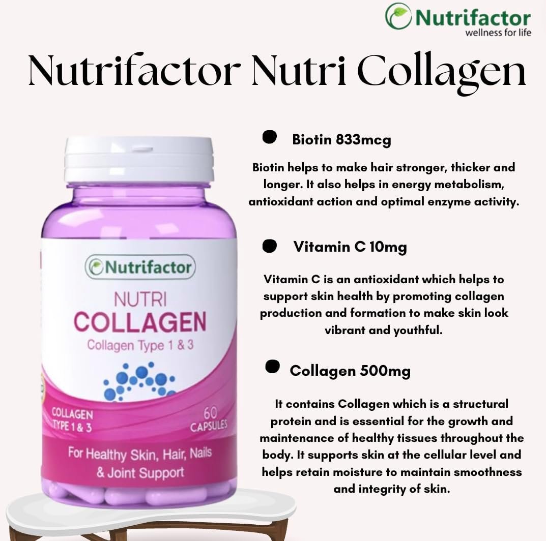 Nutrifactor’s Collagen is a premium blend of Collagen, Vitamin C, and Biotin, designed to nourish hair, skin, and nails while promoting joint flexibility and bone strength.