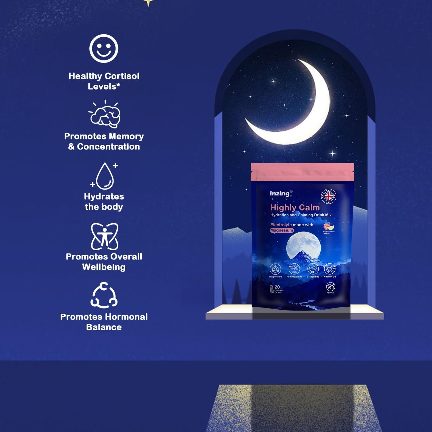 Balancing cortisol: Calm cortisol drink with the synergistic effects of Ashwagandha, Magnesium Glycinate, L-theanine and Vitamin D3. It can not only help you lower cortisol levels and soothe your mood, but also enhance your focus and memory, making your body and mind healthier.