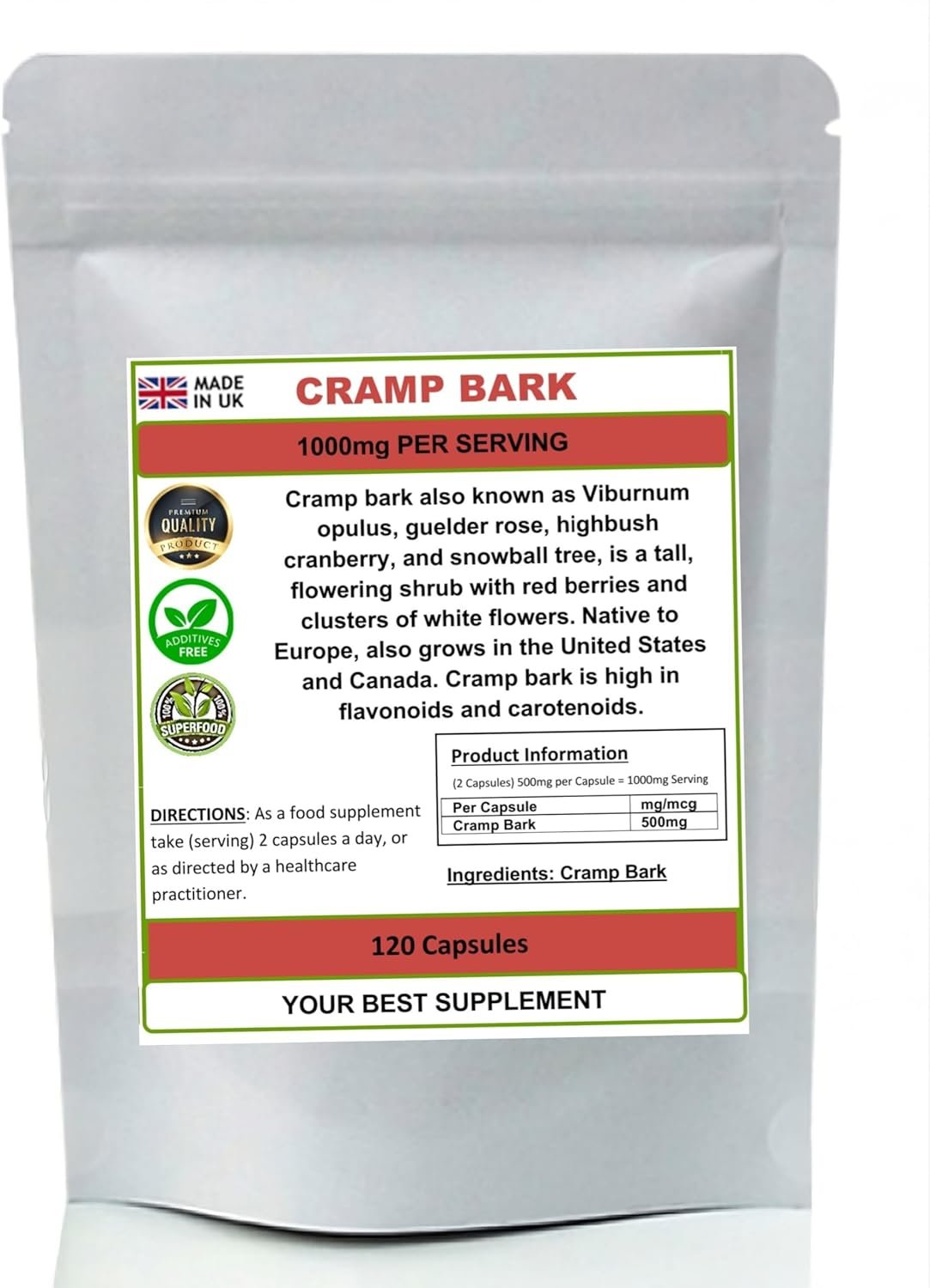 Cramp Bark (Viburnum Opulus) Capsules 1000mg Per Serving 100% Natural Cramp Bark High Strength Supplement . Each capsule contains pure highest quality Cramp Bark(no additive or fillers). Cramp bark also known as Viburnum opulus, guelder rose, highbush cranberry, and snowball tree, is a tall, flowering shrub with red berries and clusters of white flowers. Native to Europe,also grows in the United States and Canada.Cramp bark is high in flavonoids and carotenoids. Suggested use As a food supplement for adults take two Capsules a day with food,or as directed by a healthcare practitioner. Serving Size (2 Capsules) 500mg per Capsule = 1000mg Serving Ingredients: 100% Cramp Bark Allergen Advice: Produced in a facility that handles Nuts, Seeds and Almonds. Cramp Bark is a nutritional powerhouse there is a range of potential benefits of Cramp Bark…… Food supplements must not be used as a substitute for a varied and balanced diet and a healthy lifestyle. Store in a cool dry place, keep out of direct sunlight, out of reach and sight of children.