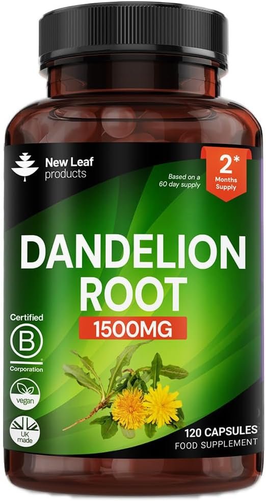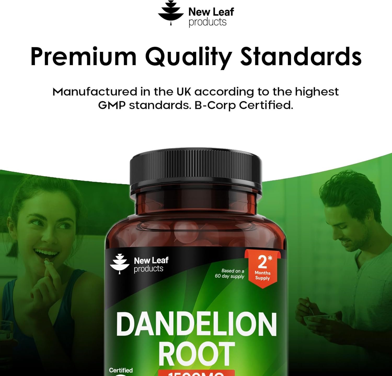 Dandelion Root Capsules – 120 High Strength Vegan Dandelion Root Extract Capsules – Water Retention Tablets, 1500mg Per Serving – 2 Months Supply Made in The UK by New Leaf