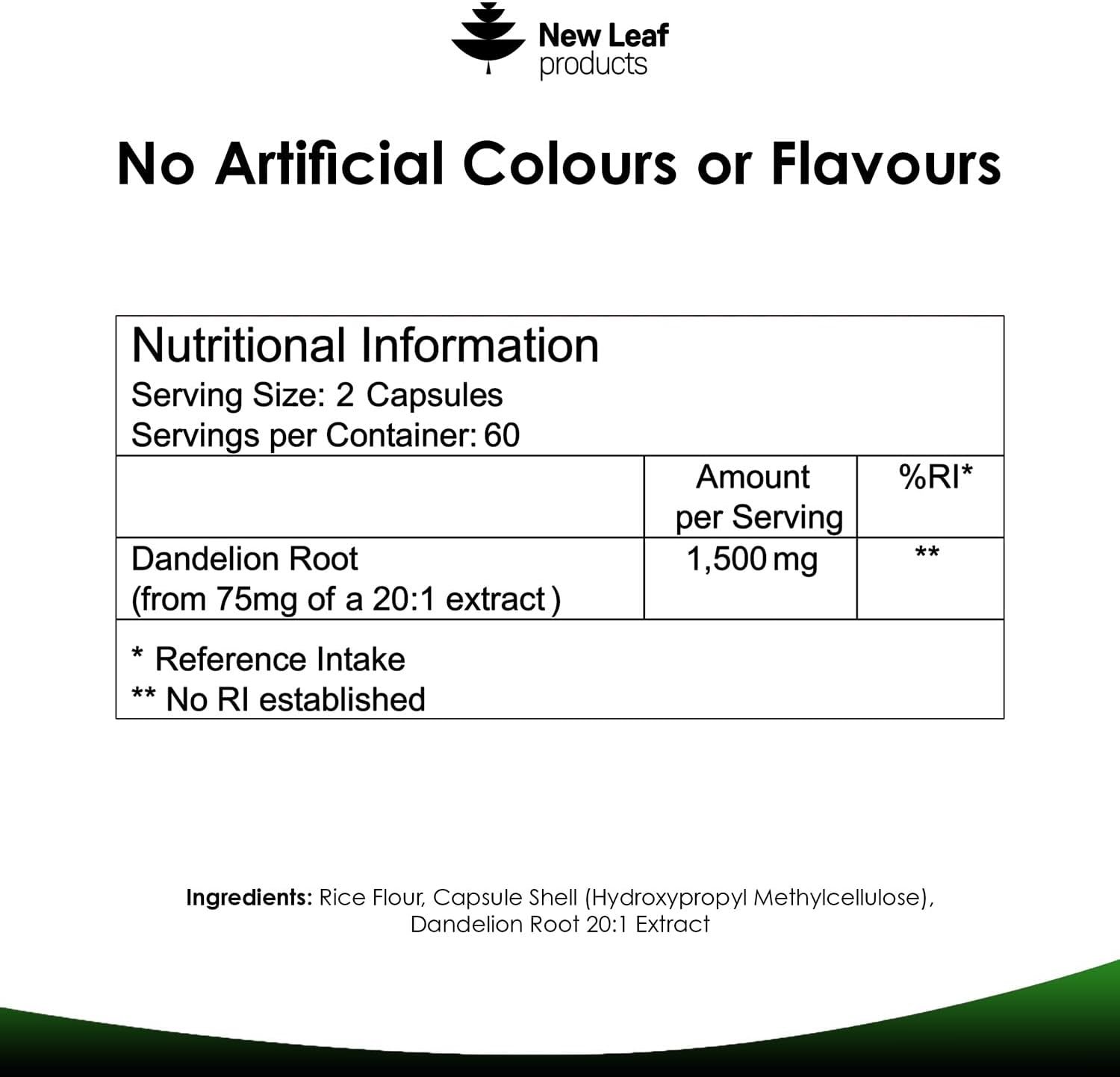 HIGH-STRENGTH DANDELION ROOT CAPSULES New Leaf’s Dandelion Root Capsules deliver 1500mg per serving, with 120 vegan capsules providing a two-month supply. Dandelion Root is derived from the common dandelion plant (Taraxacum officinale), which grows widely across Europe, Asia, and North America. Traditionally used in herbal practices, the root is harvested, dried, and ground to create a concentrated extract for supplementation. NATURAL SOURCE OF NUTRIENTS Dandelion Root naturally contains a variety of nutrients, including vitamins A, C, K, and small amounts of minerals like potassium, calcium, and iron. Using a concentrated extract ensures a higher potency of these naturally occurring compounds compared to raw forms. New Leaf’s capsules offer a simple and effective way to incorporate this traditional root into your daily wellness routine.