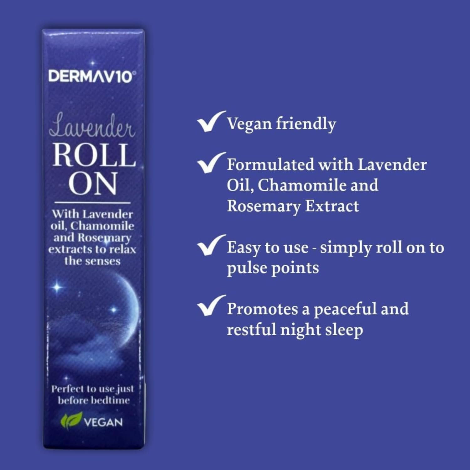 DERMA V10 LAVENDER ROLL ON – Formulated with a dreamy blend of Lavender Oil, Chamomile and Rosemary extract; 10ml bottle with roller ball top