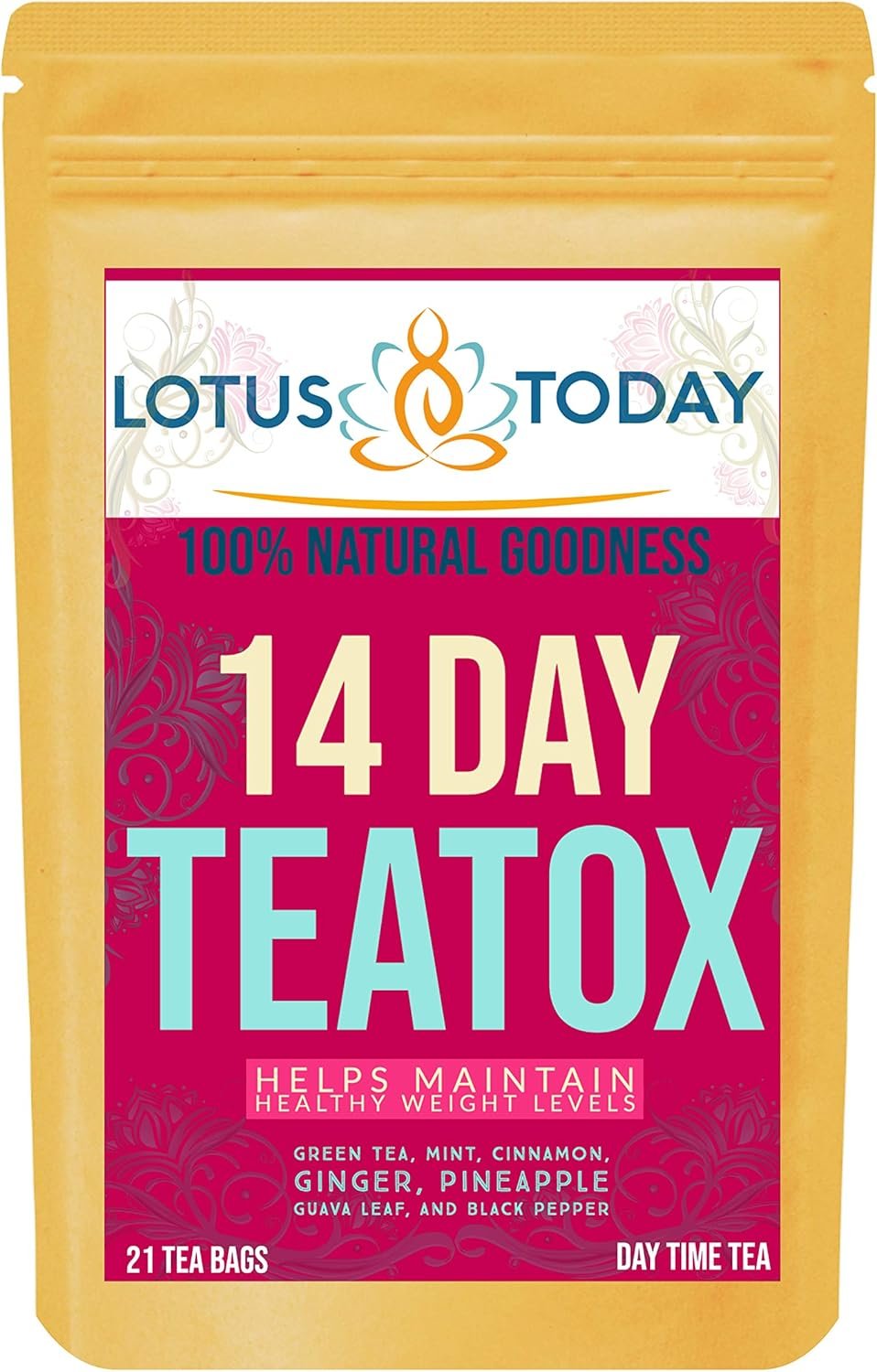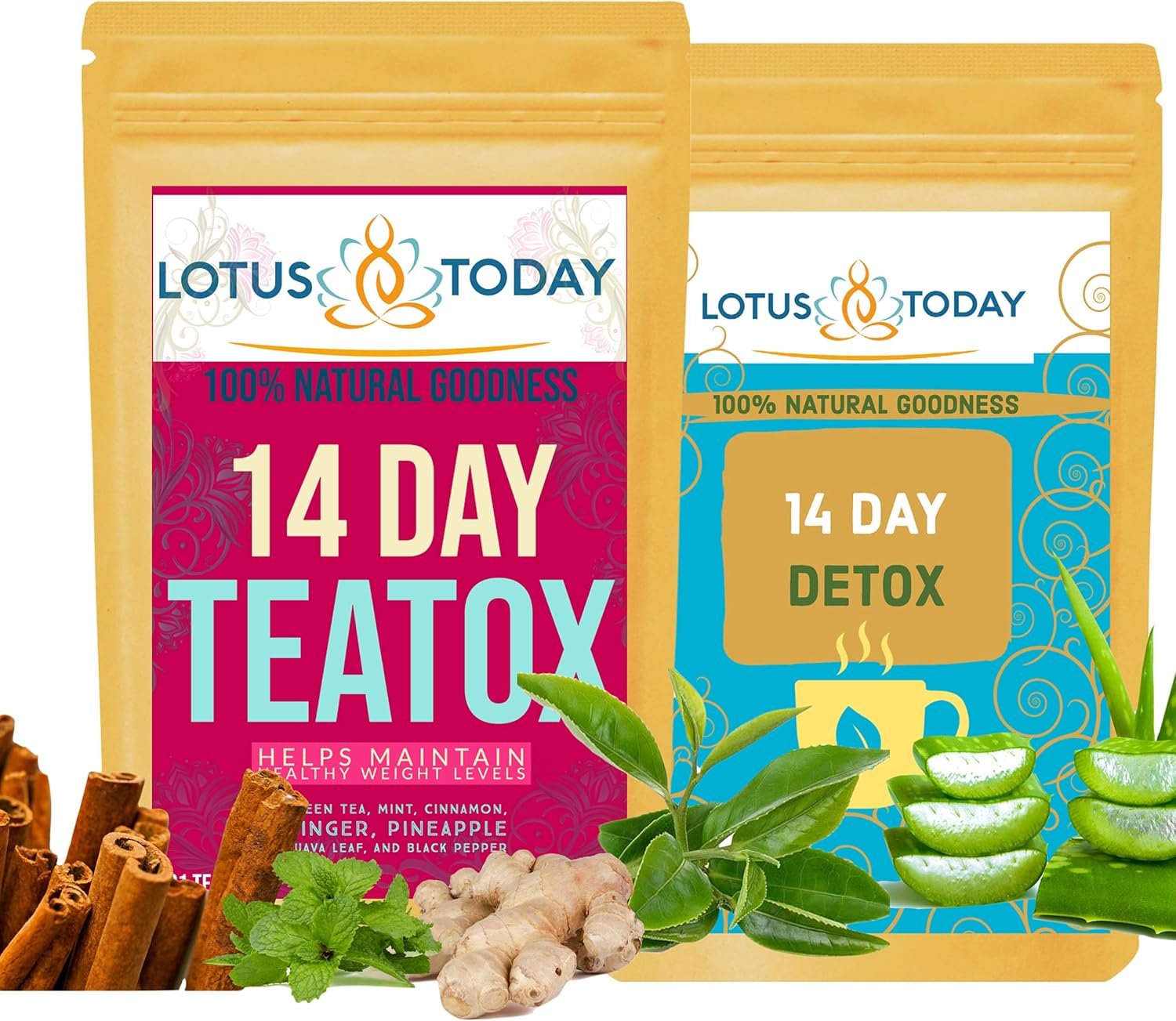TEATOX – weight Management – 28 Day supply Revitalizing Green tea blend with crispy Ceylon Cinnamon, Stimulating Organic Root Ginger and Super Green Moringa with a hint of Mint for dynamic day. A dash of guava leaves to balance the effects of carbs. Making the best use of re useable tea bags, Sip 2-3 cups for lighter, slighter & fitter day DETOX- Night Cleanse A gentle relaxing Detox tea blended with Aloe vera, fennel and Haritaki. Well worthy cuppa for the late evening or night. One cup every other day or when ever you feel like it LOTUSTODAY TEATOX TEA SET – 28-Day Supply When to drink? 1.Day Time TEATOX Tea (Non Laxative) When to Drink ? Preferably before breakfast and Lunch. How many? Use 1 or 2 Tea Bags Every day (It is absolutely fine to Re use the tea bags to make more then one cup of tea on the same Day) There are 42 ‘Day time’ Tea bags – ( Ruby Red colour pack) 2. Night Time Detox Cleanse Tea: Drink one cup of tea every other night There are 14 Detox ‘Night ’ Tea bags (Turquoise colour pack) Drink one cup of tea every other night You will you receive 56 Tea bags In total – 28 Day supply