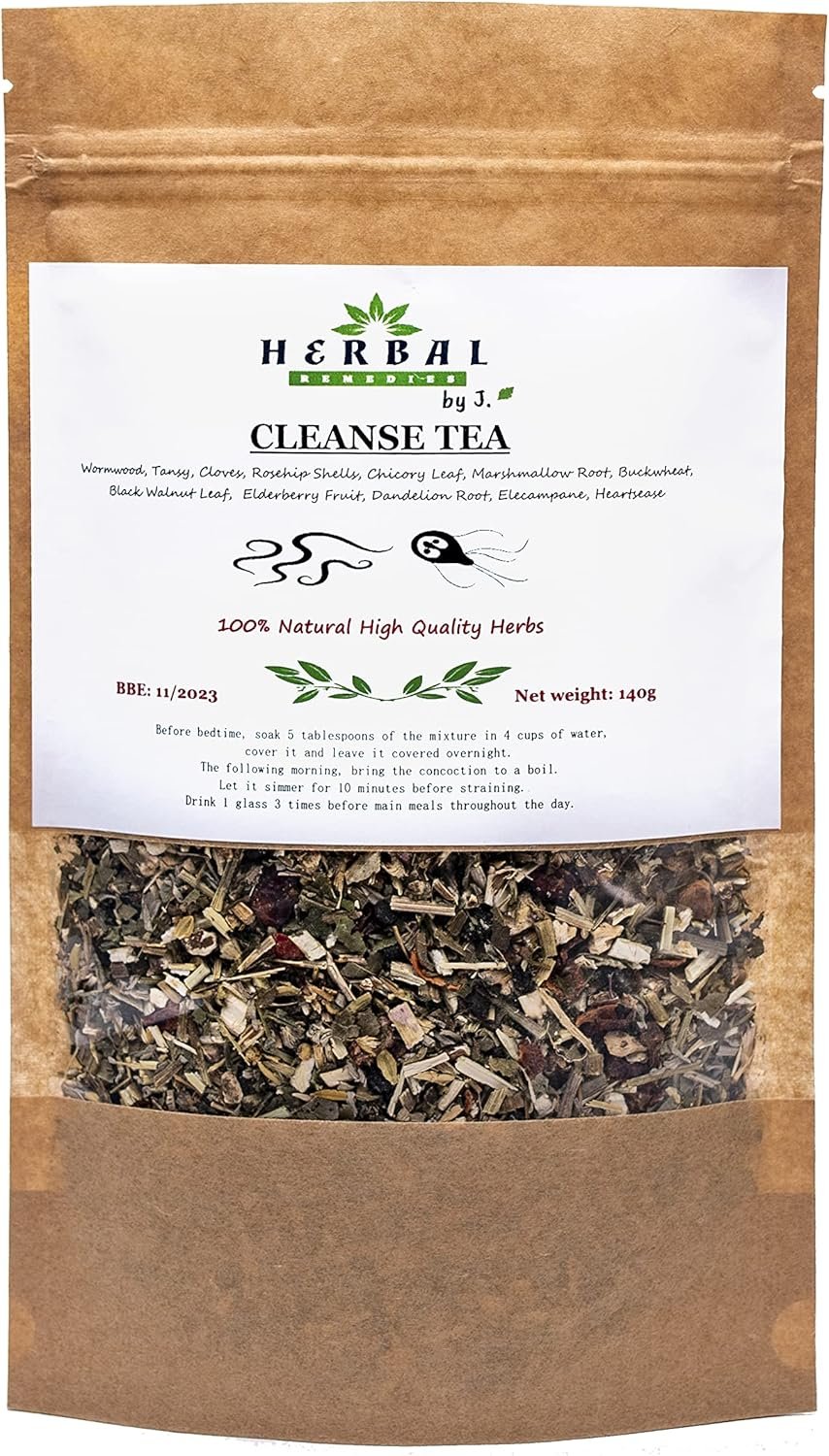 🌿140g of herbal tea contains a blend of different herbs like: wormwood cloves black walnut leaf dandelion root chicory leaf ect. Bag of 140g is for about 7 days of cleanse