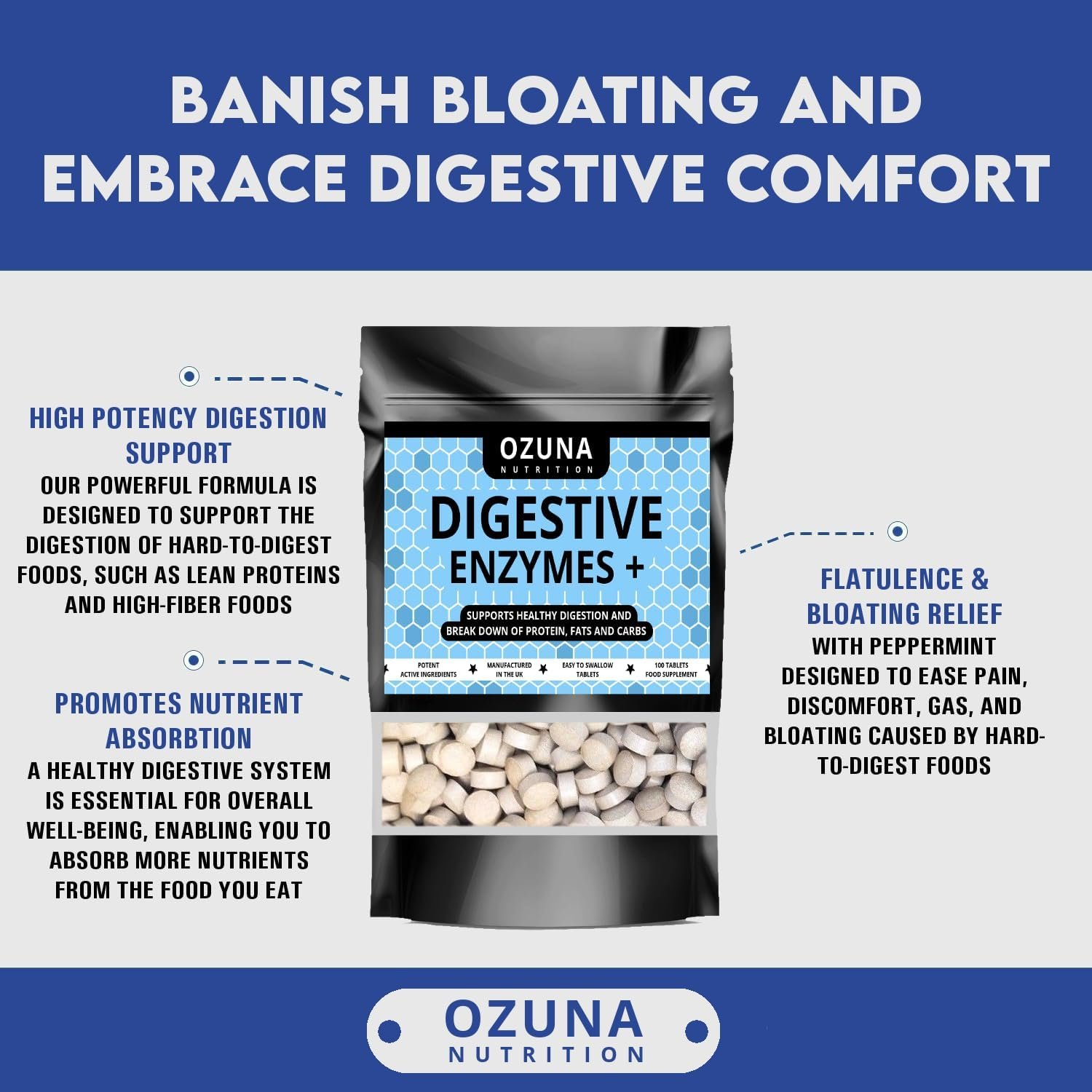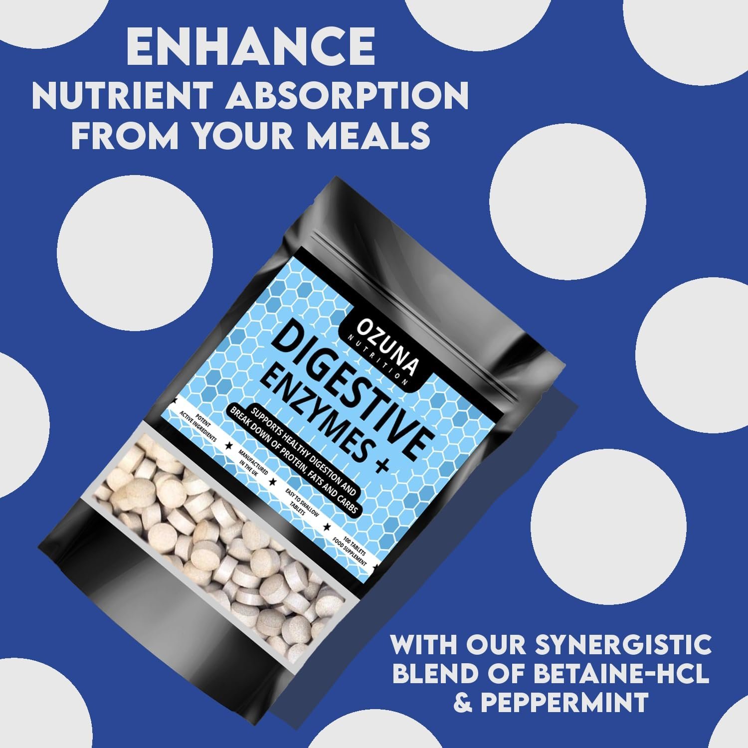 COMBAT INDIGESTION SYMPTOMS: Are you frequently dealing with discomforts such as gas, nausea, or bloating? These are common signs of indigestion. Ozuna Nutrition Digestive Enzymes+ is specifically formulated to alleviate these symptoms and promote a healthier gut.