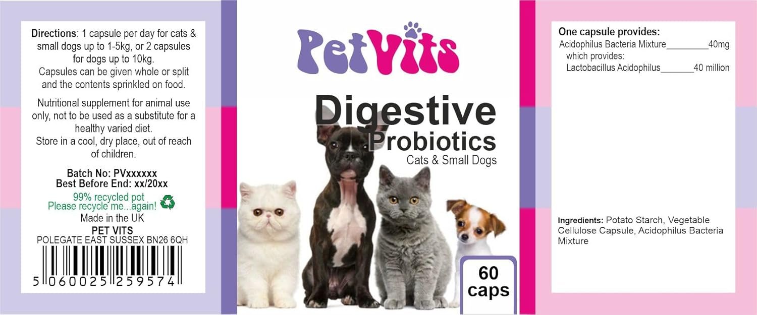 Digestive Probiotics for Cats and Small Dogs : Digestive Health Pet Supplement : 60 Capsules, in a 99% recycled pot