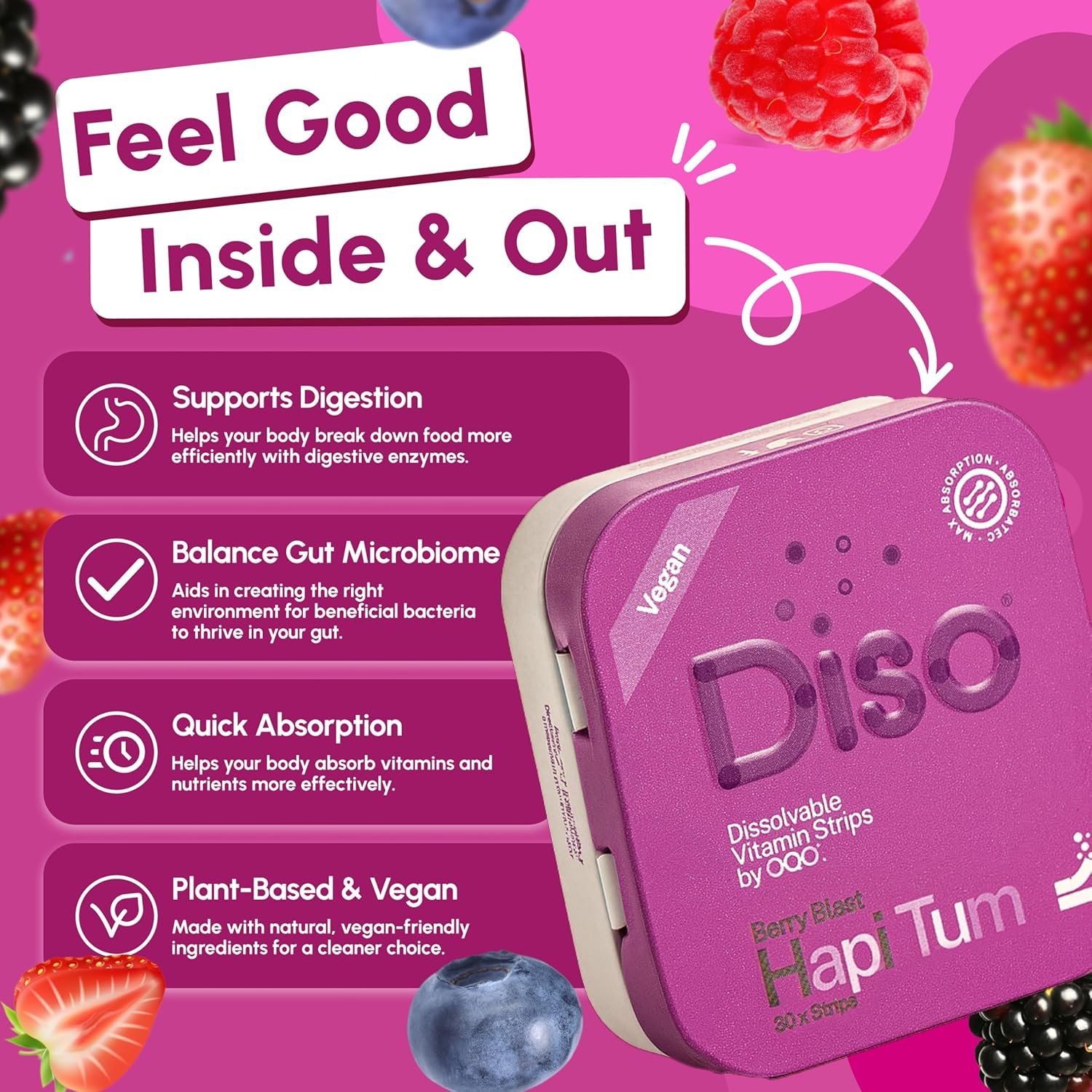 Diso Is Redefining Gut Health Supplements – Experience high absorption with Diso’s dissolvable strips! Vegan, sugar-free, and bursting with berry flavour – no water or swallowing required. Using advanced Absorbatec technology, our strips deliver up to 70% absorption, far higher than traditional gut health tablets.
