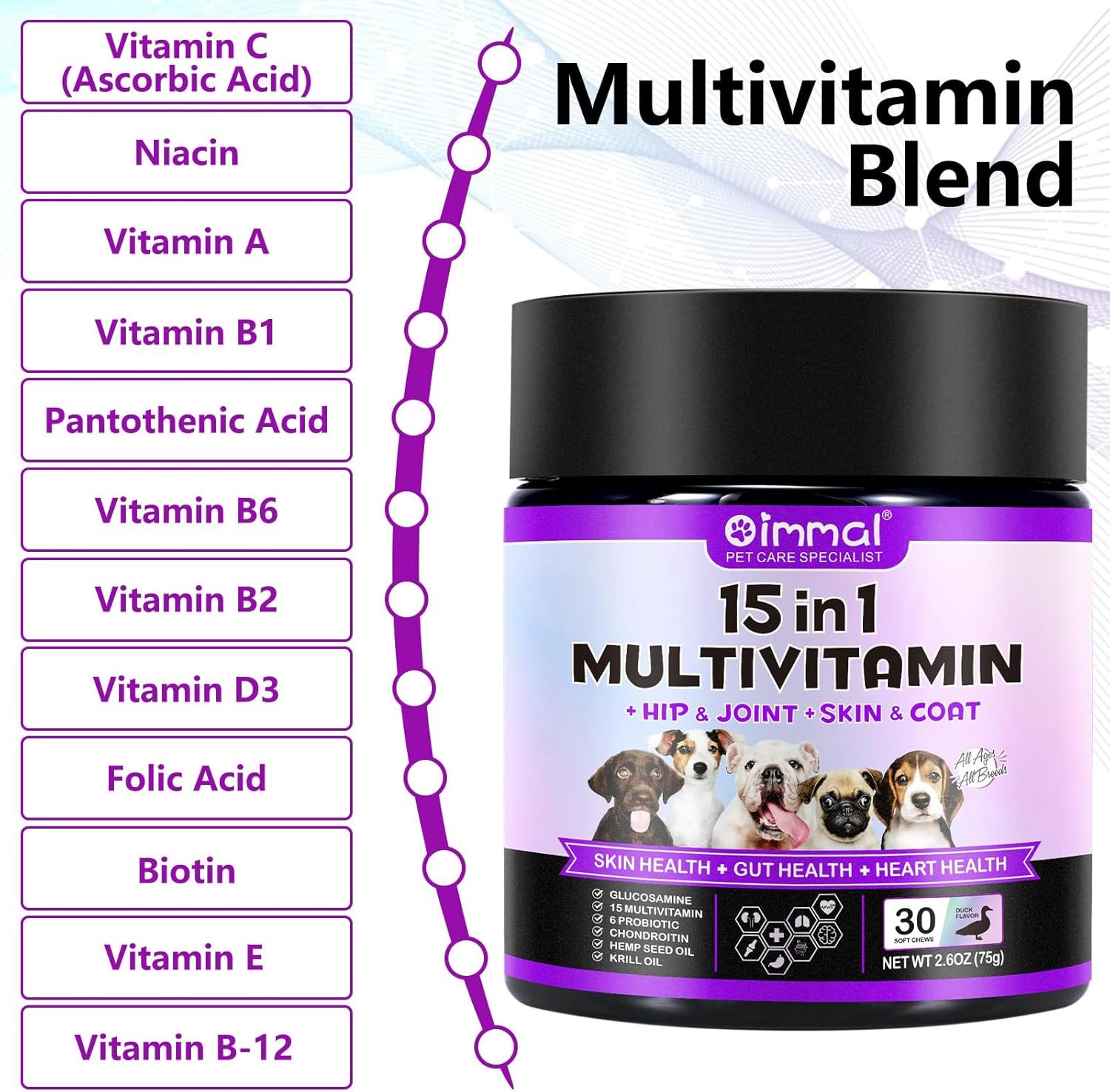 15 In 1 Dog Multivitamin Formula:Our Multivitamins are offers a unique and effective blend of dog supplements & vitamins, including 6 probiotics,chondroitin,hemp seed oil,krill oil,and biotin that support the overall health of your furry friend