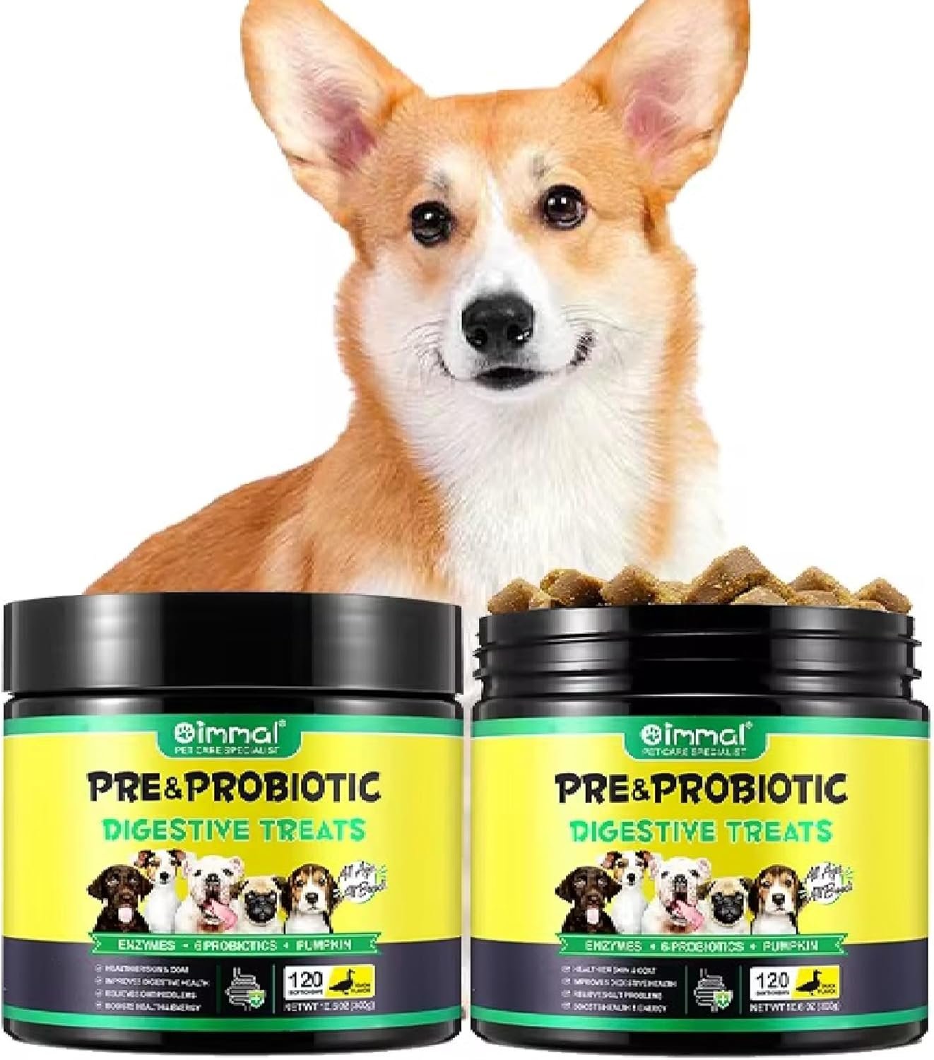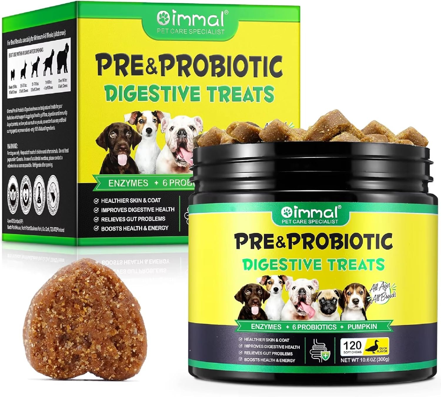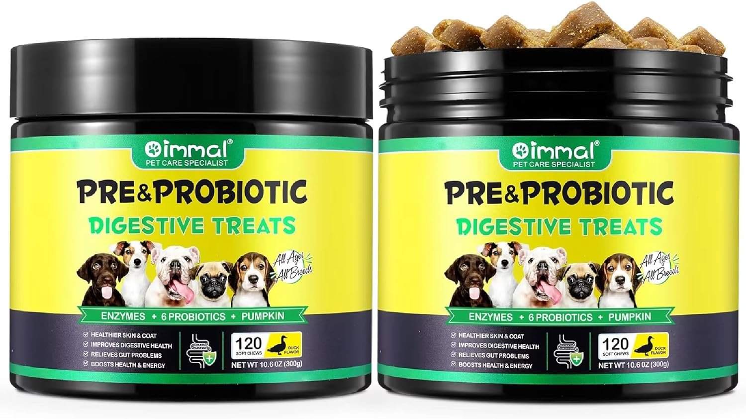 🦠 6 Multi-Strain Probiotics + Prebiotics for Dogs Contains 6 clinically studied probiotic strains and natural prebiotics for dogs, targeting gut health, nutrient absorption, and healthy gut flora. Aids in long-term digestive balance. Comparable to petlab co probiotic chew and dog probiotic paste—but in a tasty duck-flavoured chew!