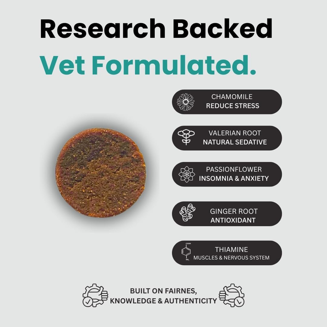 Our calming chew treats include natural ingredients like chamomile, valerian root, thiamine, and L-theanine which are known for their calming properties.