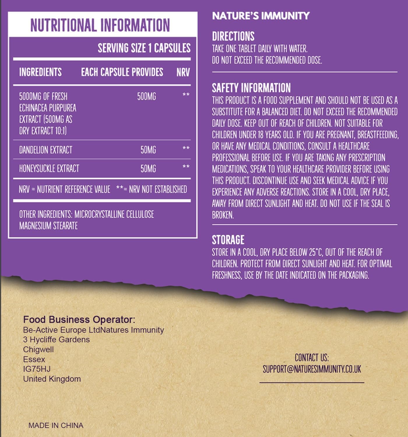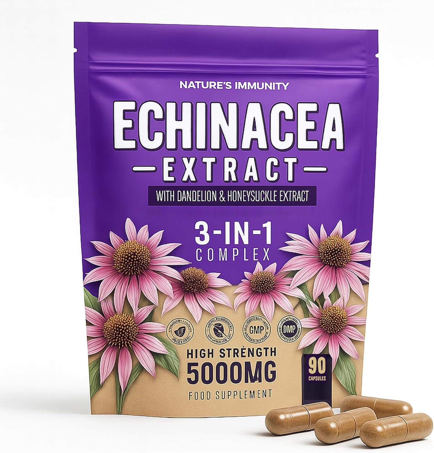 Echinacea Capsules High Strength – 5000mg Echinacea with Dandelion & Honeysuckle – Food Supplement – Vegan – one a Day – 90 Capsules per Pack (1 Single Pack)