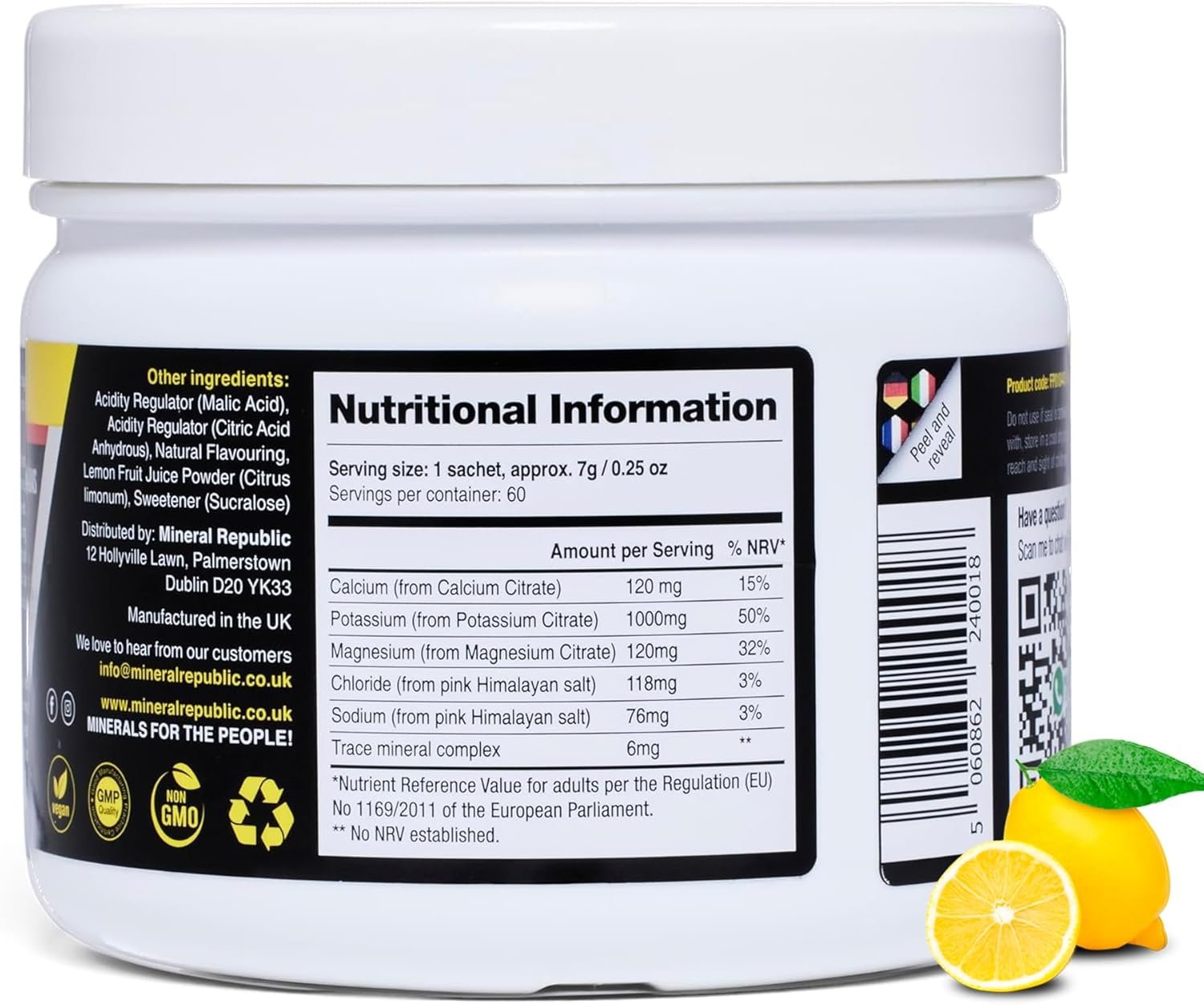 Amount per Serving % NRV* Calcium (from Calcium Citrate) 120 mg 15% Potassium (from Potassium Citrate) 1000mg 50% Magnesium (from Magnesium Citrate) 120mg 32% Chloride (from pink Himalayan salt) 118mg 3% Sodium (from pink Himalayan salt) 76mg 3% Trace mineral complex 6mg **Other ingredients: Acidity Regulator (Malic Acid), Acidity Regulator (Citric Acid Anhydrous), Natural Flavouring, Lemon Fruit Juice Powder (Citrus limonum), Sweetener (Sucralose)