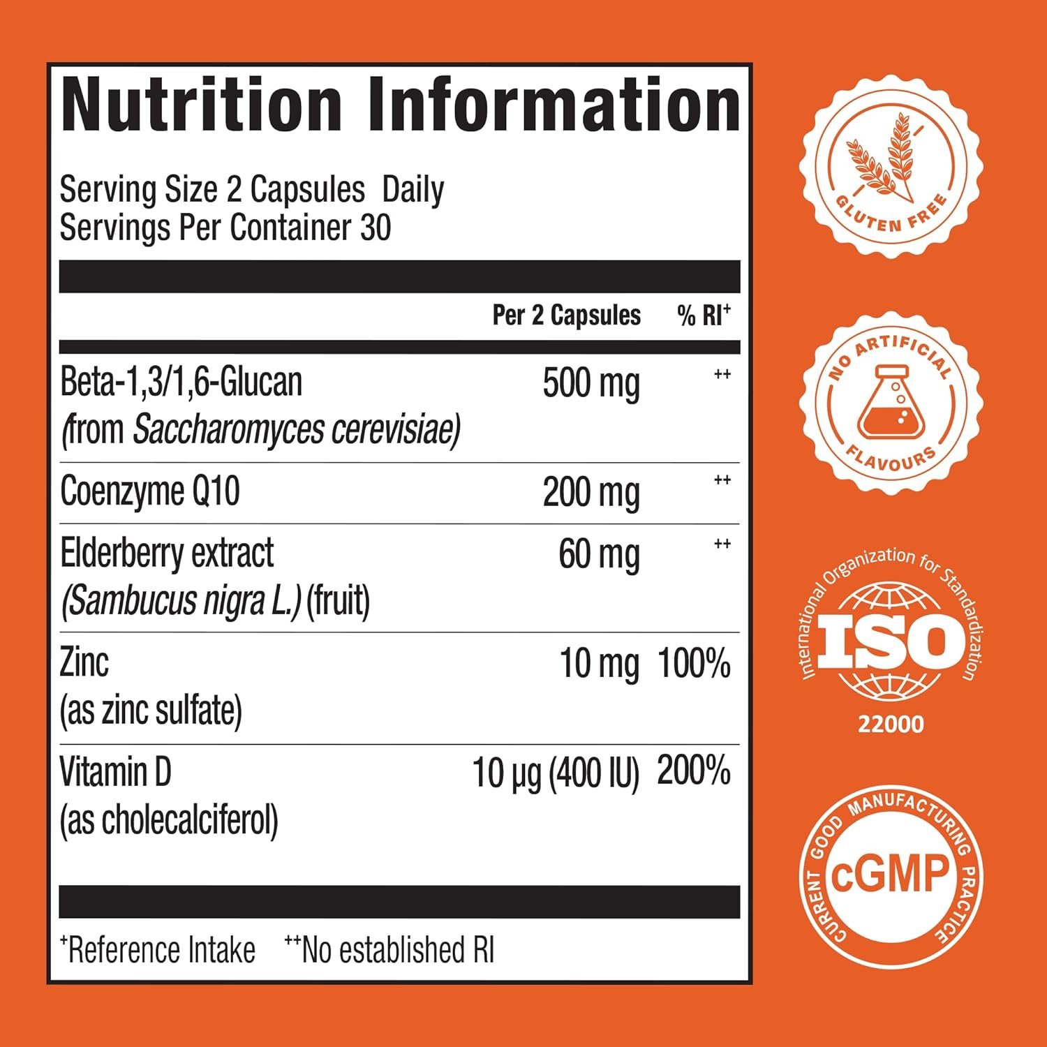 Well-known ingredients like Elderberry extract, Coenzyme Q10 and beta-1,3/1,6-glucan make the product a suitable choice for those who are looking for an all year round support and wellbeing.