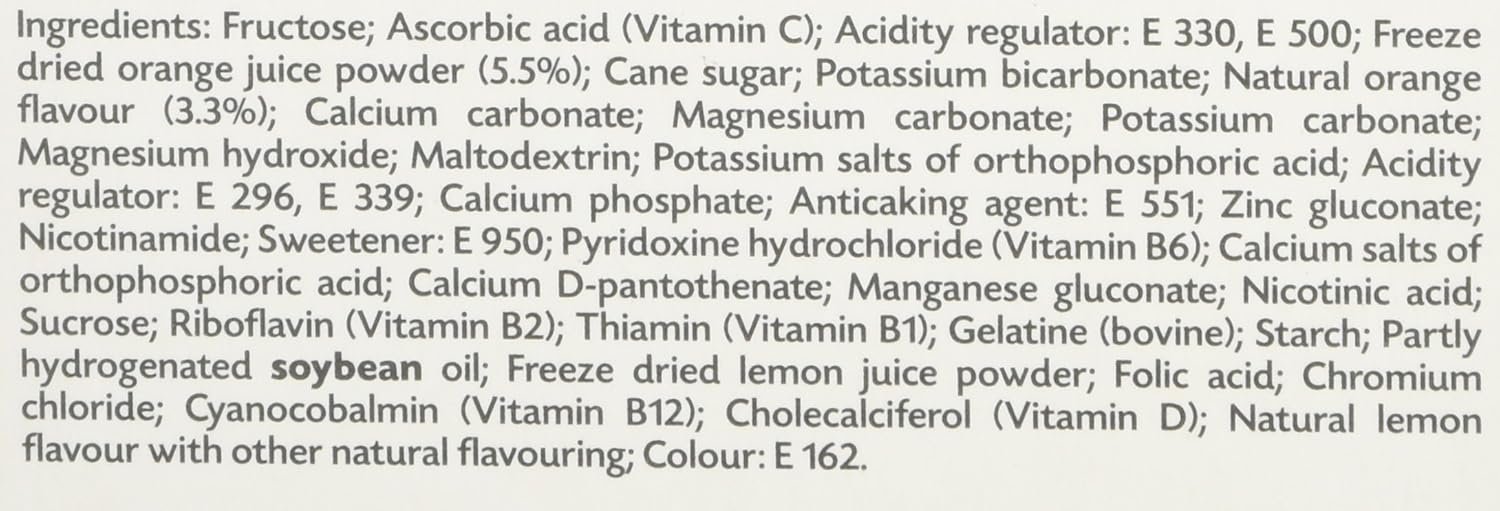 This sparkling Vitamin C drink mix is a delicious dose of vitamins and minerals that support your everyday health (contains nicotinic acid for energy release and zinc for immunity support). With each sip, 15 nutrients flow into your body in a wave of tasty fun. A tasty boost of nutrients that give you a unique balance of Vitamins and Minerals to help you going – everyday! 15 nutrients includes 1,000mg of Vitamin C for immune support, plus packed with Vitamin B12 and B6 contributing to a reduction of tiredness and fatigue. 1 Sachet Contains: Vitamin C 1,000 mg (1,250% EU-RDA), Vitamin B1 1.5 mg (136% EU-RDA), Vitamin B2 1.7 mg (121% EU-RDA), Vitamin B6 6 mg (429% EU-RDA), Vitamin B12 18 ug (720% EU-RDA), Vitamin D 10 ug (200% EU-RDA), Folic Acid 100 ug (50% EU-RDA), Nicotinic acid (B3) 25 mg (156% EU-RDA), Pantothenic Acid 5 mg (83% EU-RDA), Potassium 300 mg (15% EU-RDA), Calcium 120 mg (15% EU-RDA), Magnesium 95 mg (25% EU-RDA), Manganese 0.575 mg (29% EU-RDA), Chromium 10 ug (25% EU-RDA), Zinc 3 mg (30% EU-RDA). Ingredients Ingredients: Fructose; Ascorbic acid (Vitamin C); Acidity regulator: E 330, E 500; Freeze dried orange juice powder (5.5%); Cane sugar; Potassium bicarbonate; Natural orange flavour (3.3%); Calcium carbonate; Magnesium carbonate; Potassium carbonate; Magnesium hydroxide; Maltodextrin; Potassium salts of orthophosphoric acid; Acidity regulator: E 296, E 339; Calcium phosphate; Anticaking agent: E 551; Zinc gluconate; Nicotinamide; Sweetener: E 950; Pyridoxine hydrochloride (Vitamin B6); Calcium salts of orthophosphoric acid; Calcium D-pantothenate; Manganese gluconate; Nicotinic acid; Sucrose; Riboflavin (Vitamin B2); Thiamin (Vitamin B1); Gelatine (bovine); Starch; Partly hydrogenated SOYBEAN oil; Freeze dried lemon juice powder; Folic acid; Chromium chloride; Cyanocobalmin (Vitamin B12); Cholecalciferol (Vitamin D); Natural lemon flavour with other natural flavouring; Colour: E 162. Directions For adults, one sachet a day. Just empty contents into a glass of water and stir. Do not exceed the recommended daily dosage. A healthy lifestyle and a varied and balanced diet are important. This product should not be used as a substitute for a varied diet Safety Warning For short-term treatment of re�ux symptoms (heartburn, acid regurgitation) in adults, aged 18 or over. Do not use if you are allergic to esomeprazole or any of the other ingredients of this medicine. Talk to your pharmacist or doctor if: You are taking any medicines listed in the package lea�et. You are over 55 and have new or recently changed re�ux symptoms. Nexium Control Gastro-Resistant Tablets. Contains Esomeprazole. Always Read The Label. Box Contains 24 Orange sachets
