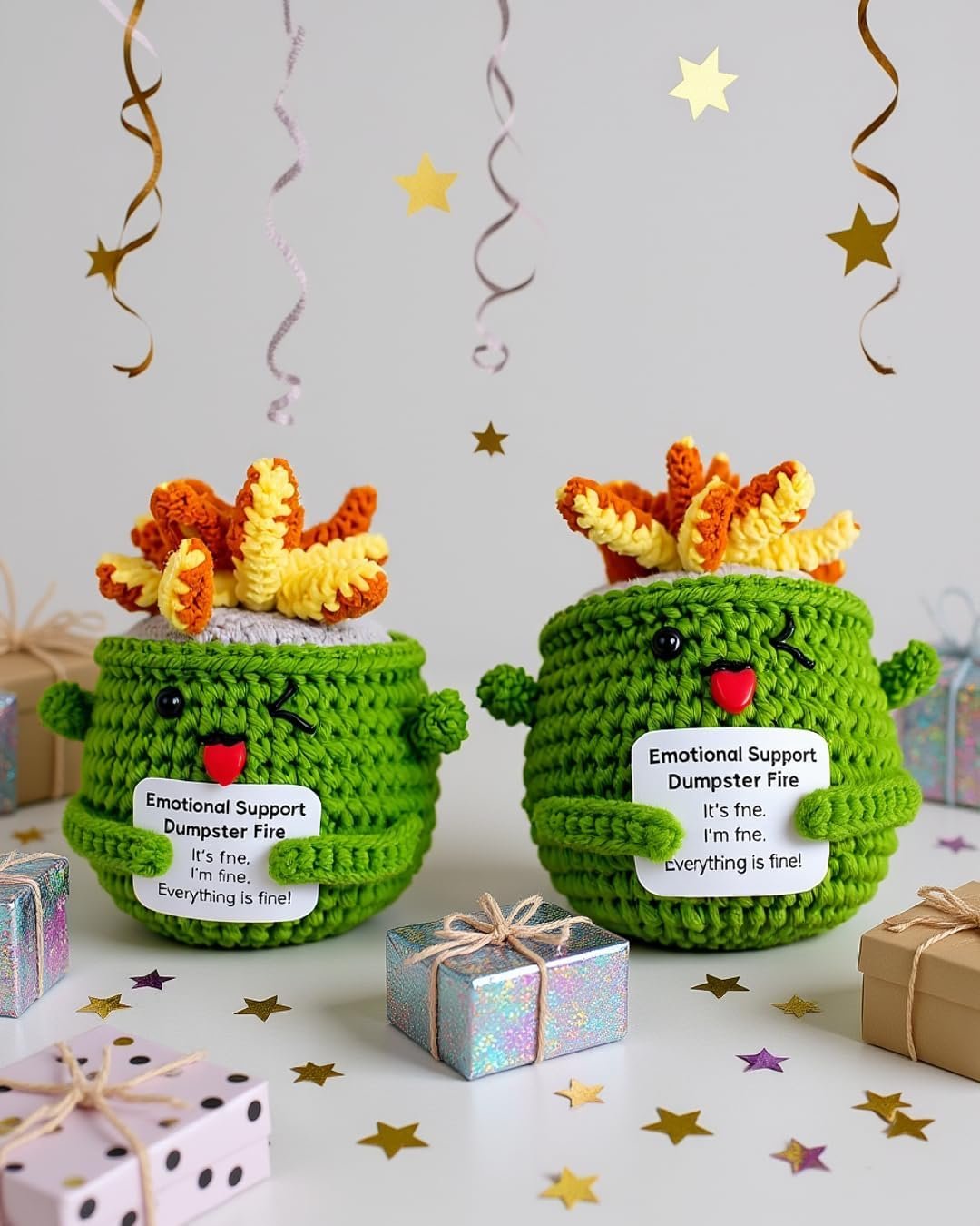 HANDCRAFTED DESIGN: Whimsical crochet dumpster fire plush that serves as a humorous emotional support companion for stressful times