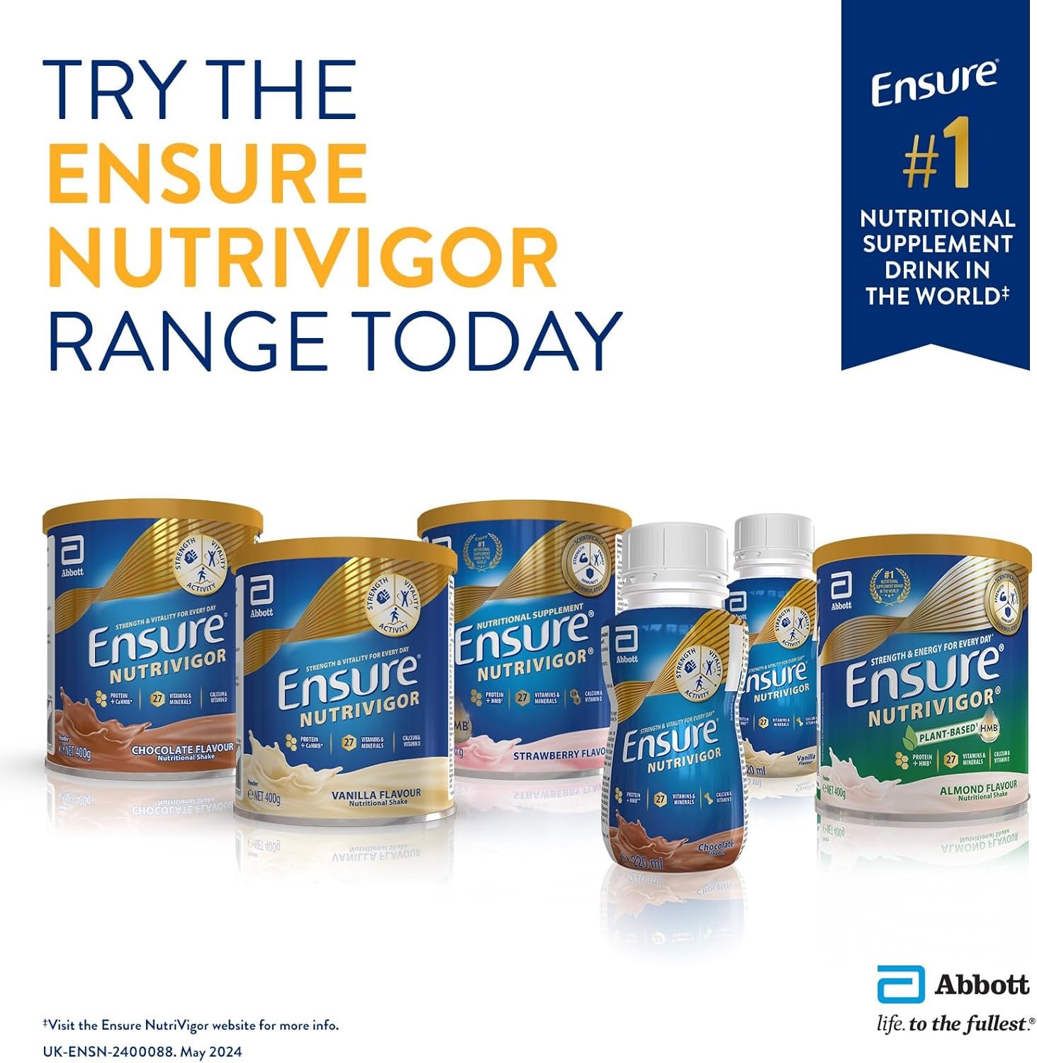 Ensure NutriVigor is a food supplement with protein, vitamins, minerals and HMB2, and is a source of: · Protein to maintain muscle** mass and calcium and vitamin D to maintain normal bones and normal muscle function · Vitamins C, B2, B6, B12, niacin, folate & pantothenic acid, which contribute to the reduction of tiredness and fatigue§ · Vitamins A, B6, B12, C, D, selenium, copper and folate, which contribute to the normal function of the immune system ‡Source: Euromonitor International Limited; Consumer Health 2024 edition, per Supplement Nutrition Drinks category definition, retail value sales, RSP, 2023 data. †Support Strength – Contains vitamin B2, vitamin B6 and vitamin B12 which contribute to the reduction of tiredness and fatigue. Contains calcium and potassium which contributes to normal muscle function. Contains vitamin D which contribute to the maintenance of normal muscle function. ^Contains vitamin B2, vitamin B6 and vitamin B12 which contribute to the reduction of tiredness and fatigue. Contains calcium and potassium which contributes to normal muscle function. Contains vitamin D which contribute to the maintenance of normal muscle function. Ensure NutriVigor helps you feel stronger in 6 weeks. 110 independently-living adults aged 50–80 years old, who reported a lack of energy, added 1-2 servings of Ensure NutriVigor to their daily diet. Participants reported improvements in energy and activity levels. §Support Energy – vitamins B2, B6, B12, and C contribute to the reduction of tiredness and fatigue and to normal energy-yielding metabolism. *Support Immunity – Contains vitamin A, B6, B12, C, D, folate, selenium and copper, which contribute to the normal function of the immune system. 2HMB (ß-hydroxy-ß-methylbutyrate) is an active metabolite of leucine, among the constituent elements of proteins, naturally found in some foods but in small quantities. **Helping your muscles- Protein contributes to a growth in muscle mass and the maintenance of muscle mass.