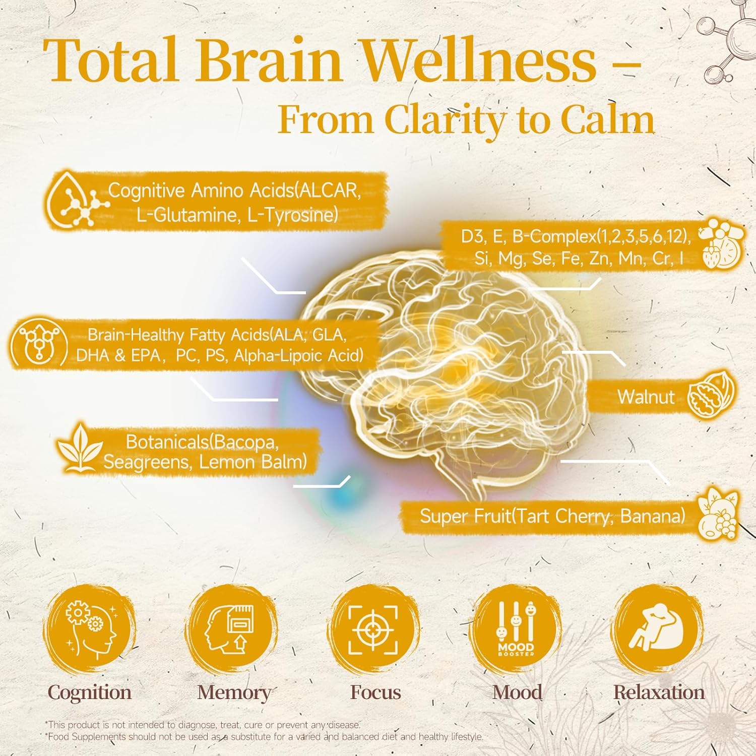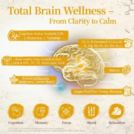 Brainpower Botanicals: Ginkgo Biloba, Bacopa Monnieri, and Green Tea extract to support memory, clarity, and cognitive function.