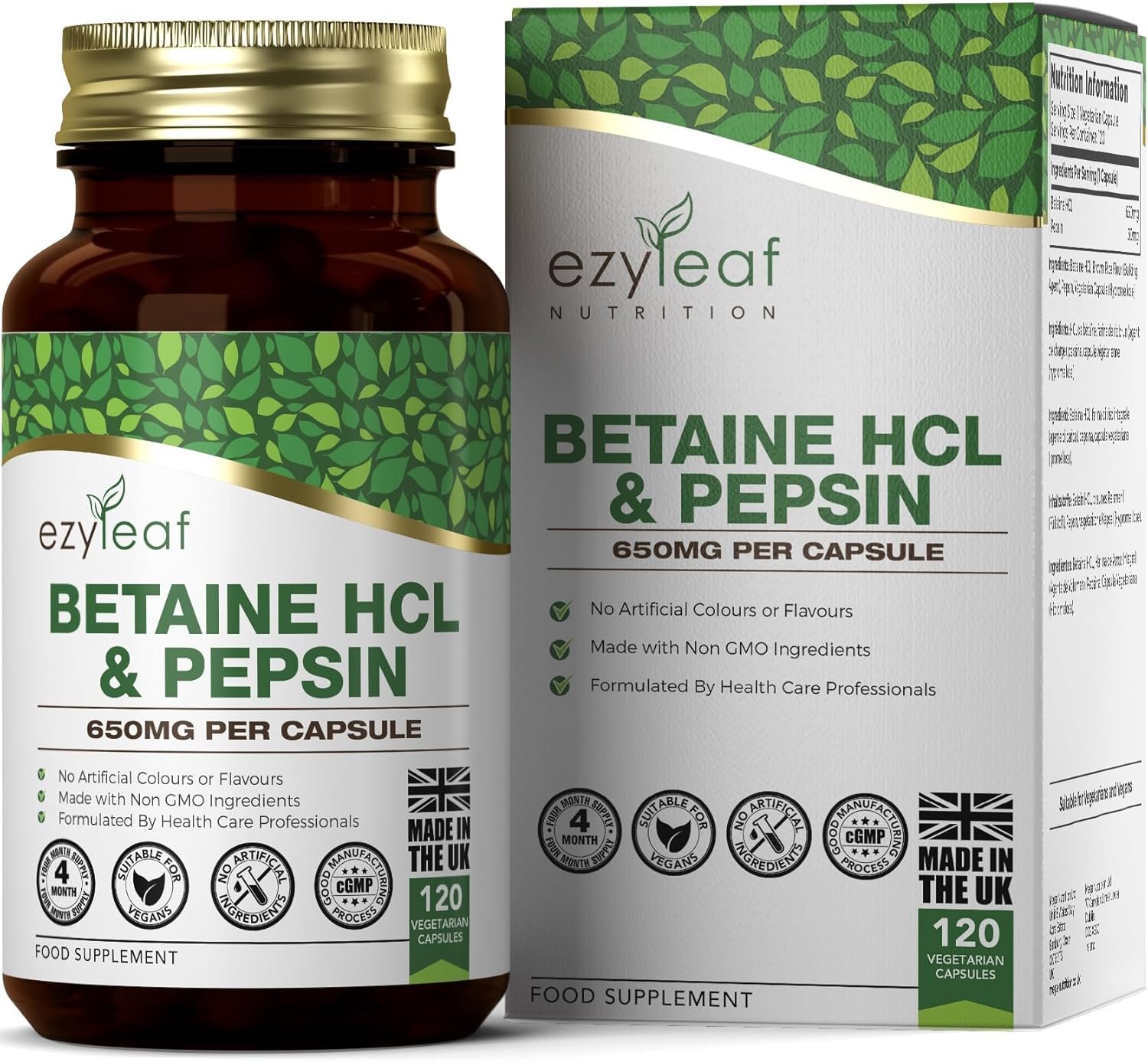 Ezyleaf Betaine HCL with Pepsin 650mg | 120 Vegan Capsules | Betaine Hydrochloride with Pepsin | Digestive Enzyme Supplements | No Artificial Ingredients | ISO Certified, Gluten Free Non-GMO | UK Made