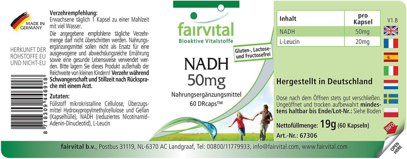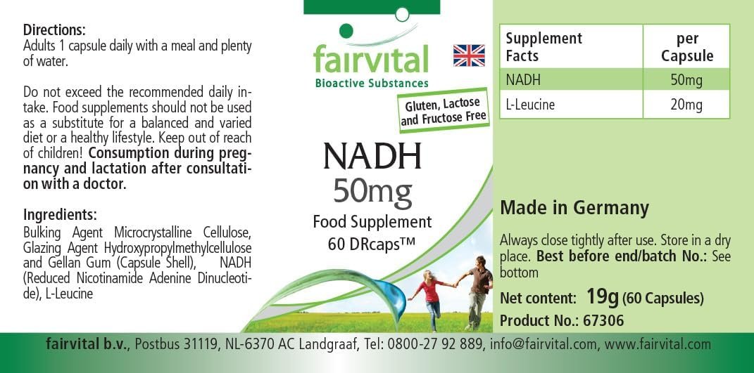 ✔ Fairvital GERMAN QUALITY: Daily dose: 1 capsule daily contains 50mg NADH. Highly dosed! Excellent price-performance ratio! Delayed release in the small intestine due to DRCaps!
