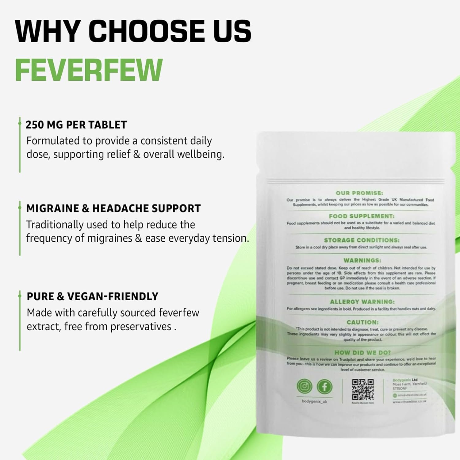 Feverfew 250mg Tablets – Migraine Headaches Relief Joints Health Anti Inflammatory Natural Supplement – 120 Tablets 4 Month Supply